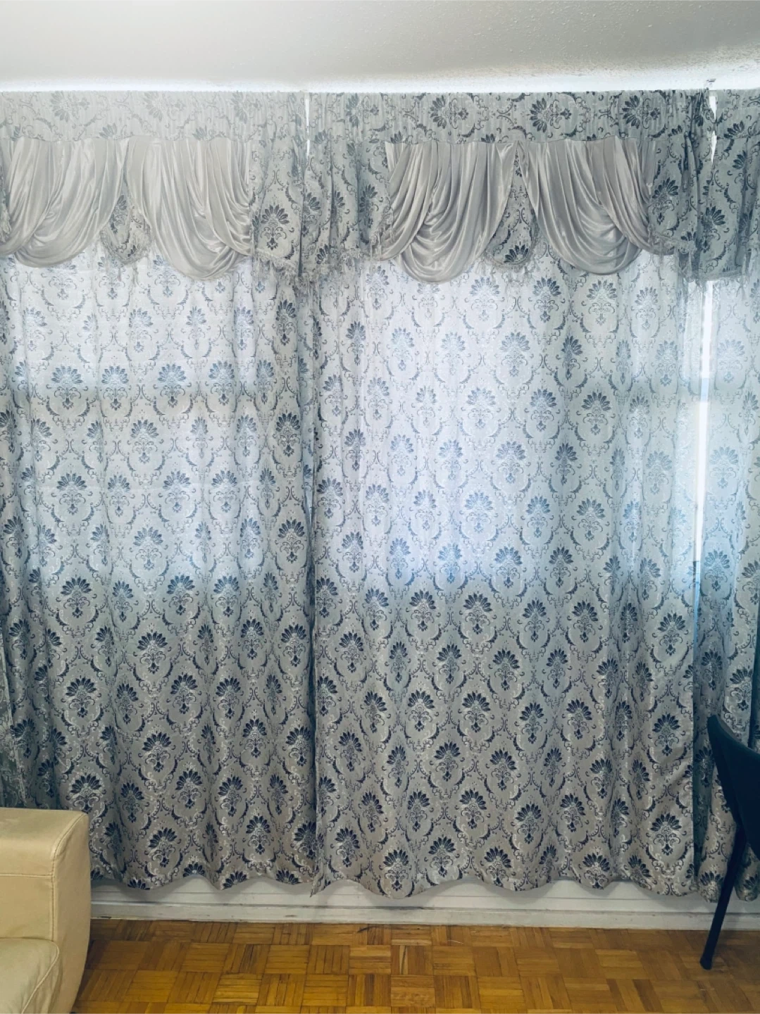 Set of patterned curtains with a decorative valance. Features a repeating damask design in grey and white. These curtains are sure to add a touch of elegance to any room. Perfect for living rooms or bedrooms!