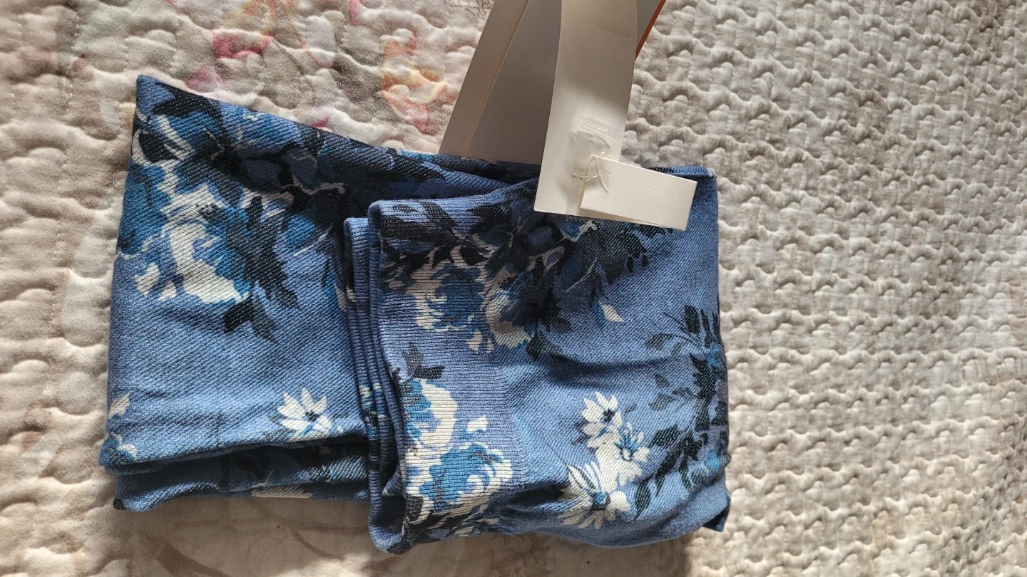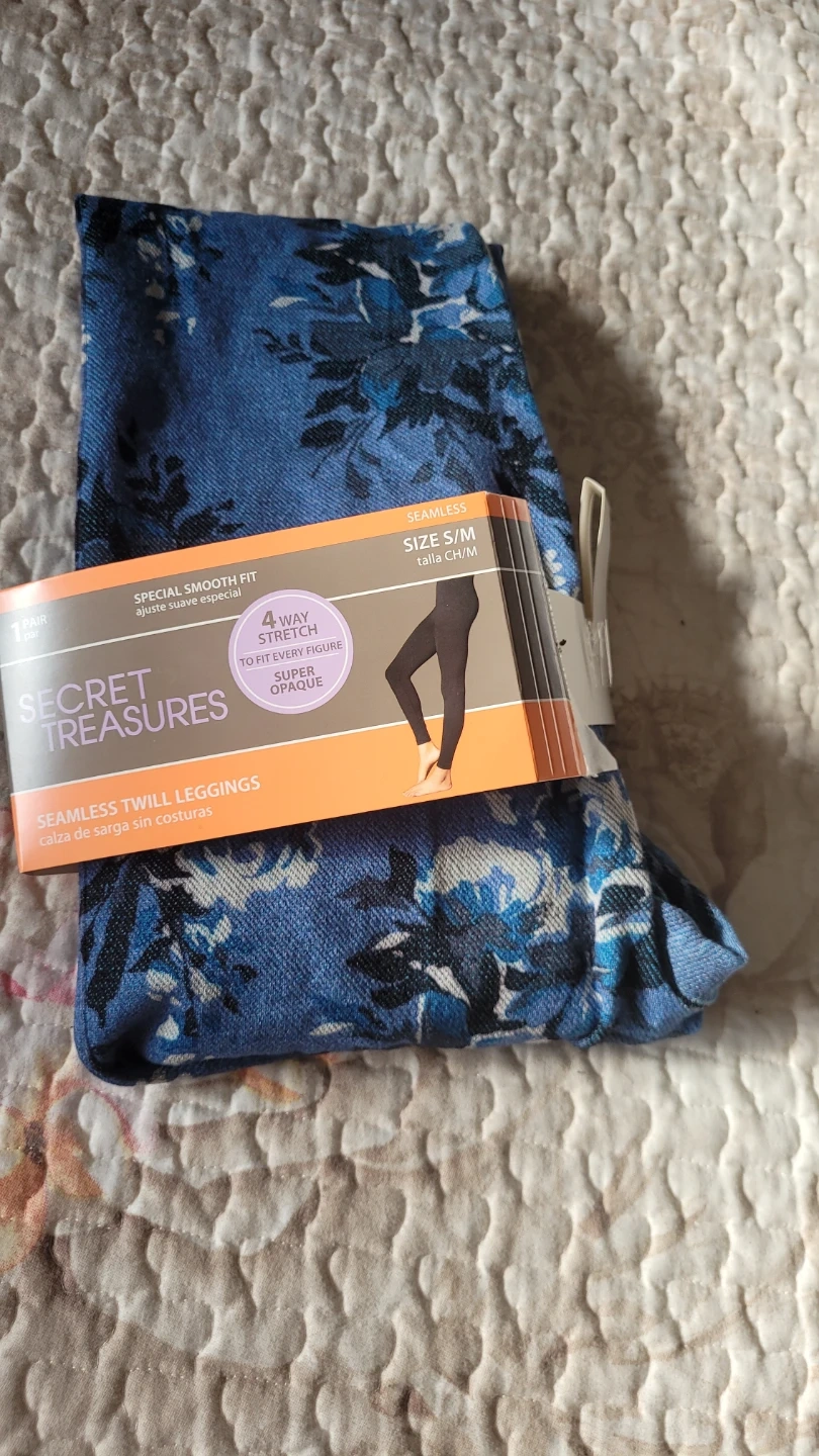These are Secret Treasures seamless twill leggings. They're size S/M with a special smooth fit and 4-way stretch. The blue floral pattern is really pretty!