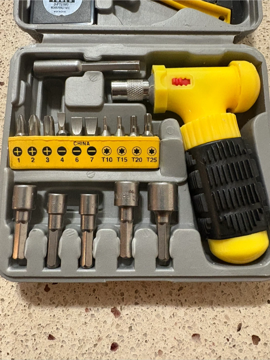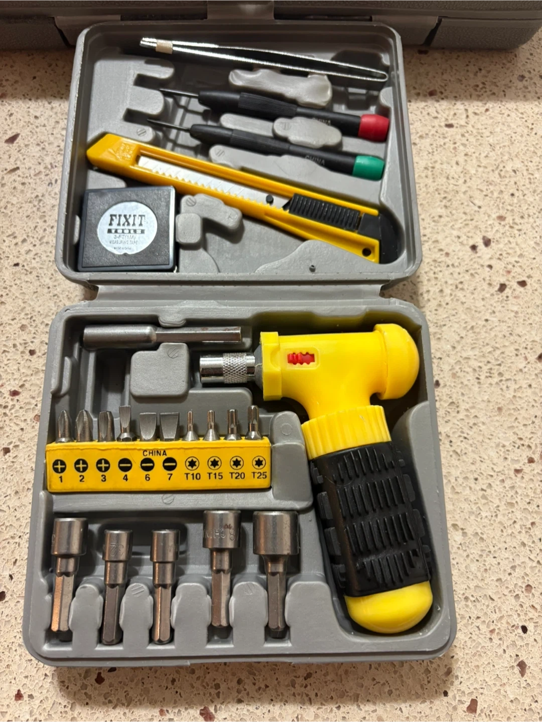 This FIXIT TOOLS set includes a precision screwdriver set, a utility knife, and various bits. It also comes with a 3ft/1m measuring tape. Great for small repairs and electronics work!