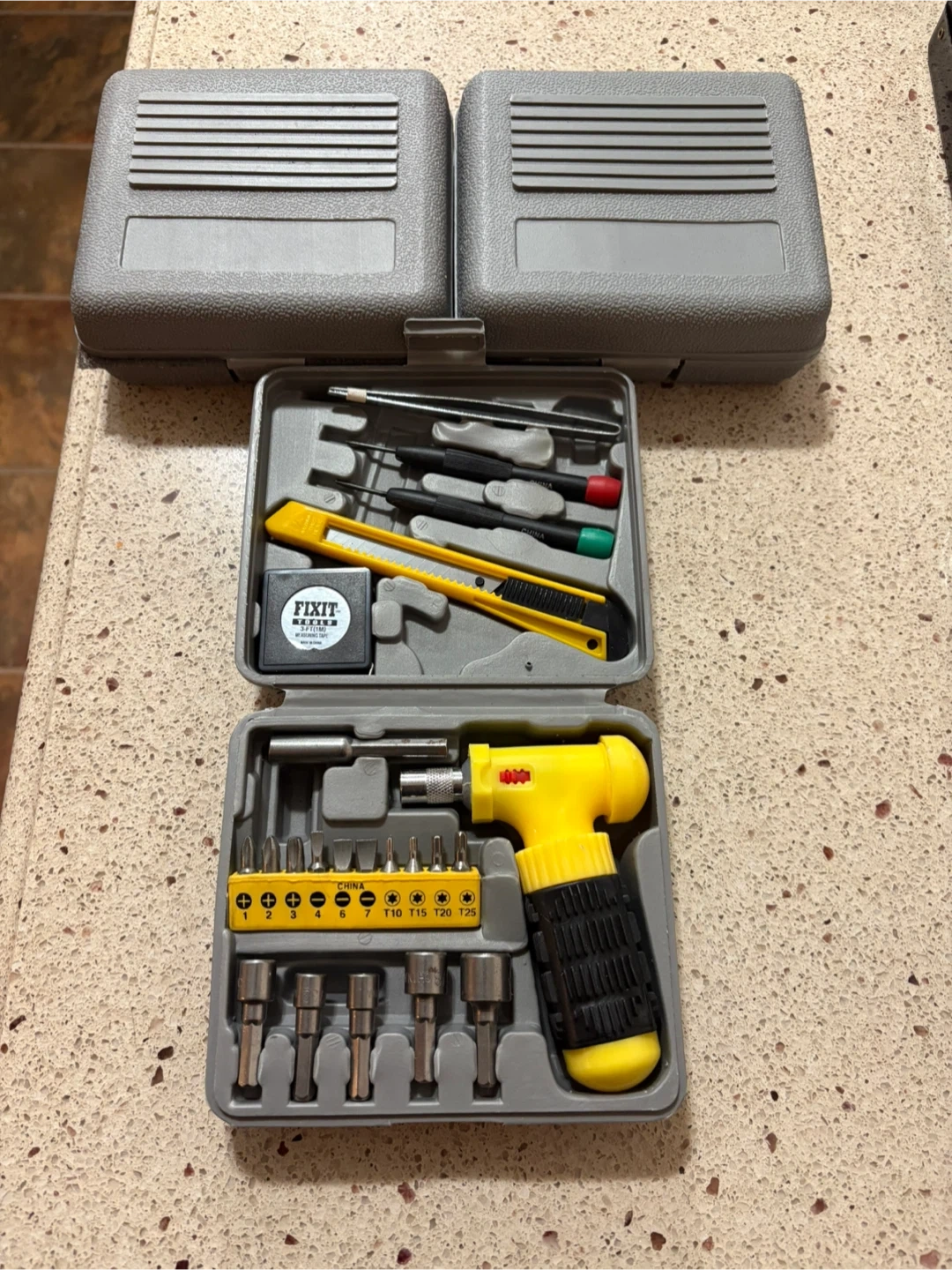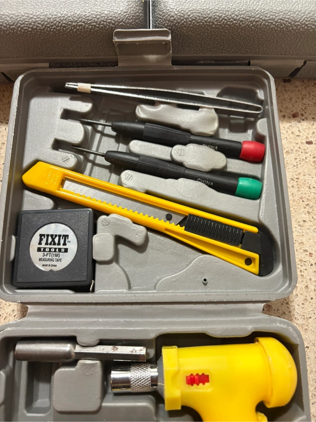 This FIXIT TOOLS set includes a precision screwdriver set, a utility knife, and various bits. It also comes with a 3ft/1m measuring tape. Great for small repairs and electronics work!