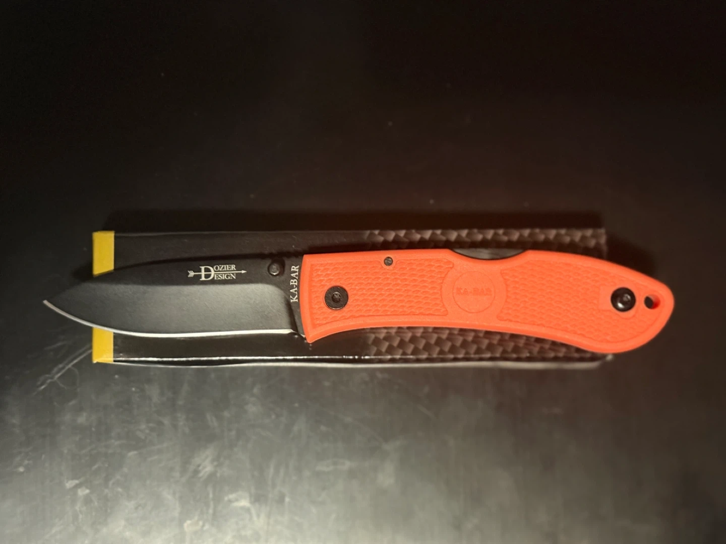 This KA-BAR Dozier Folding Knife features an orange handle and a black blade. It's a Dozier Design Master Series knife. Very light knife, Includes original box.