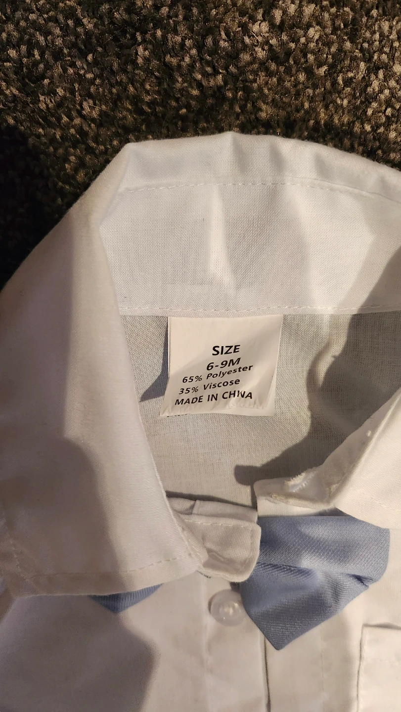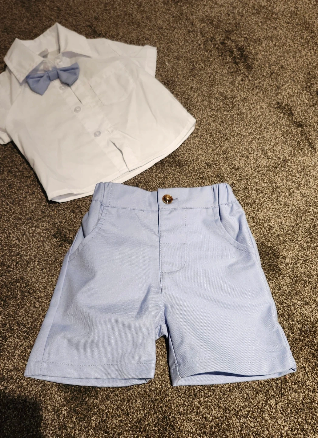 Cute two-piece outfit for baby boys. It's a white short-sleeve collared shirt with a light blue bowtie attached. Includes light blue shorts with an elastic waistband and two back pockets. Size 6-9 months