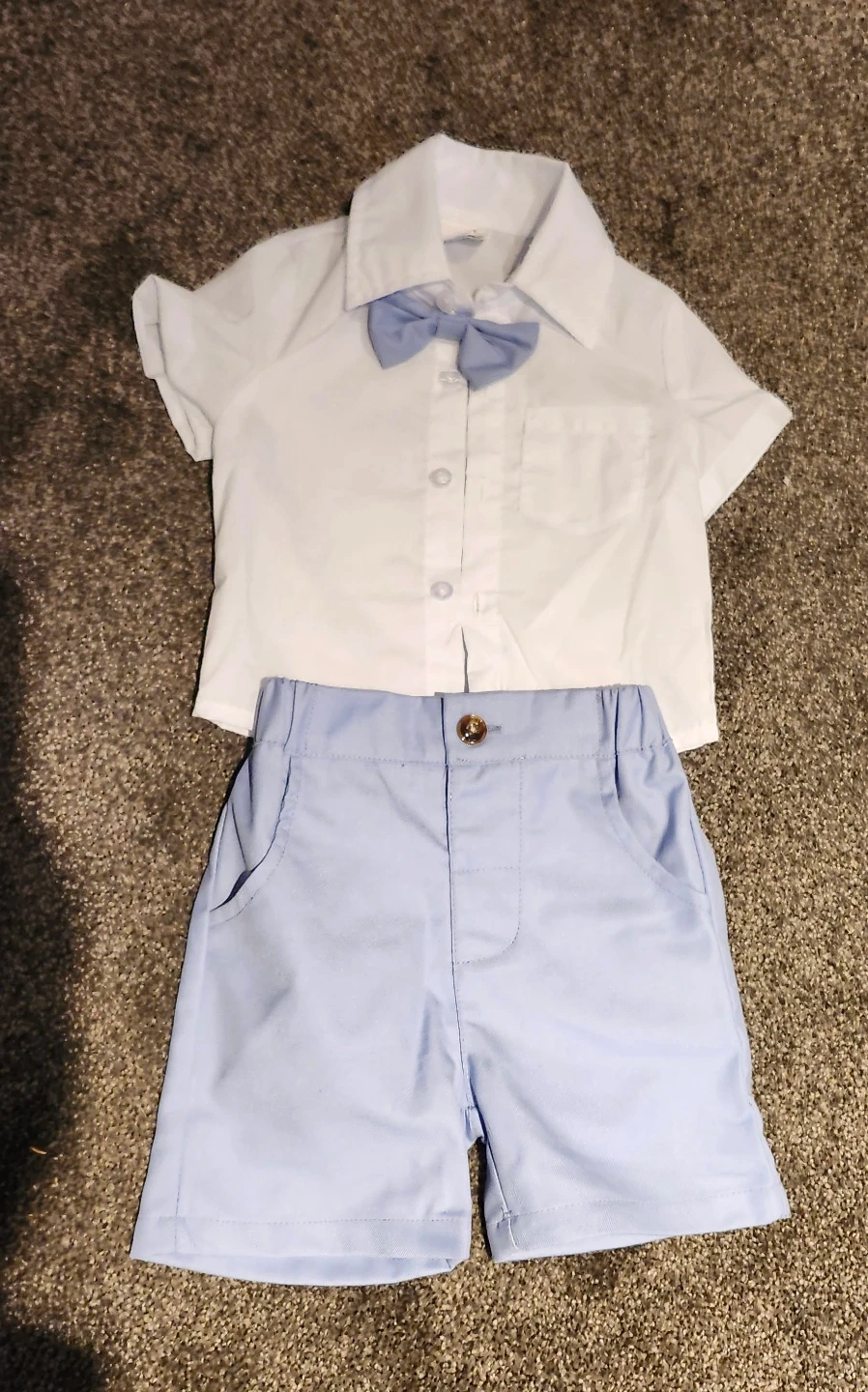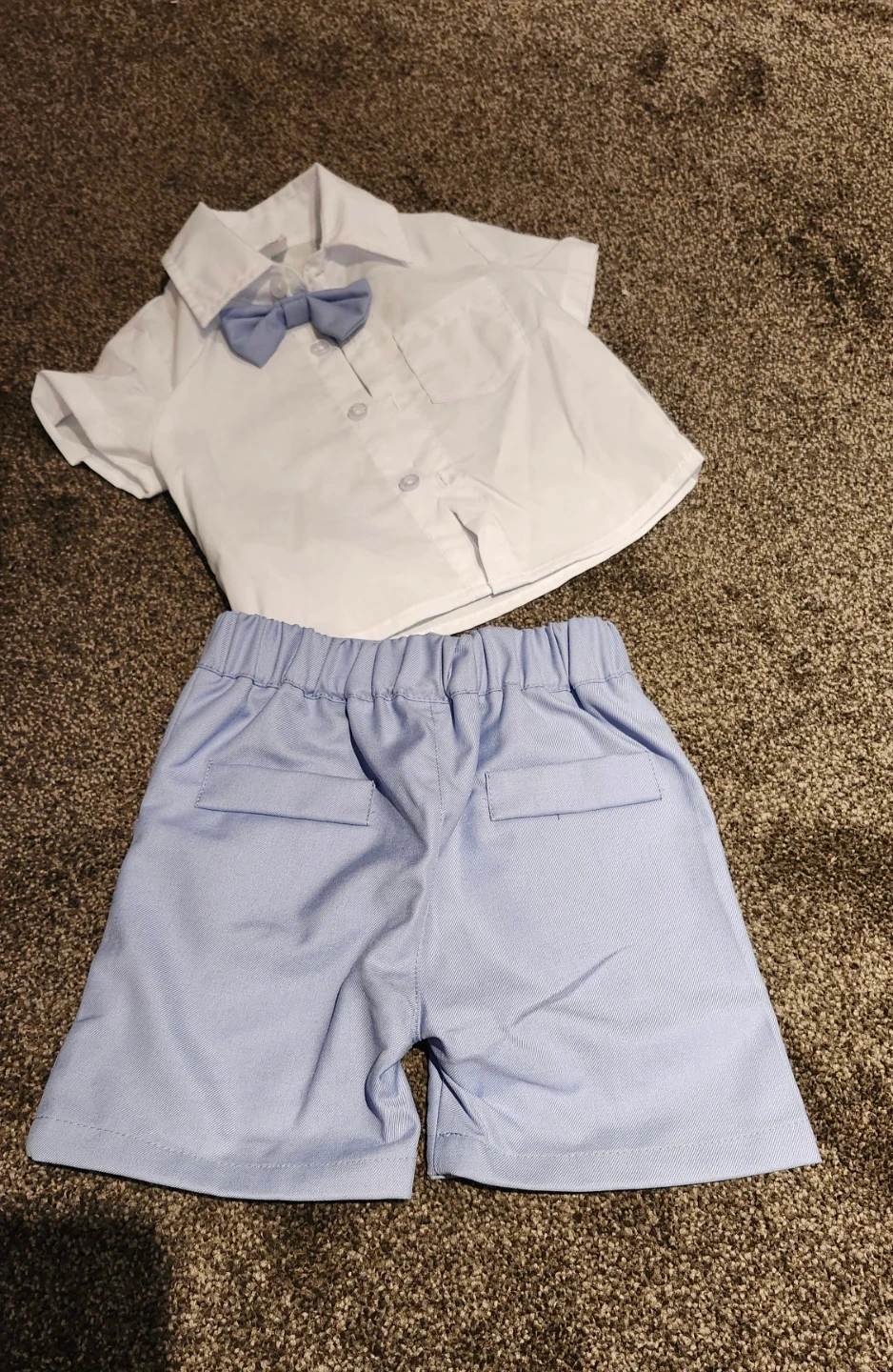Cute two-piece outfit for baby boys. It's a white short-sleeve collared shirt with a light blue bowtie attached. Includes light blue shorts with an elastic waistband and two back pockets. Size 6-9 months