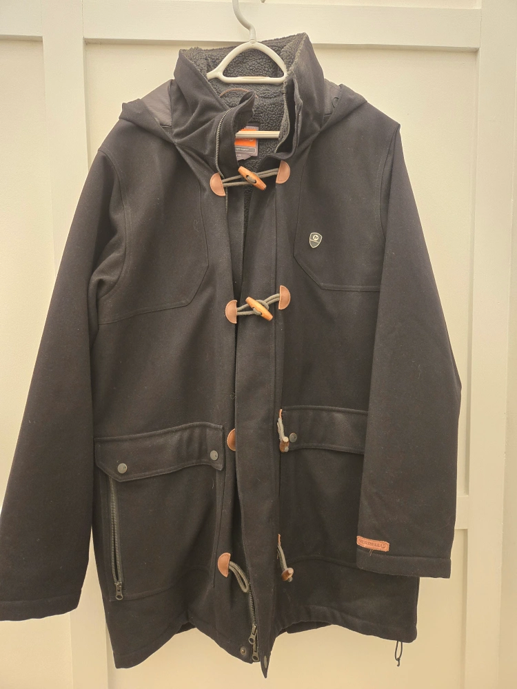 Selling a lightly used Merrell dark blue duffle coat . It's made from a wool blend and features a hood, toggle fastenings, and multiple pockets. Perfect for staying warm and stylish during the colder months!