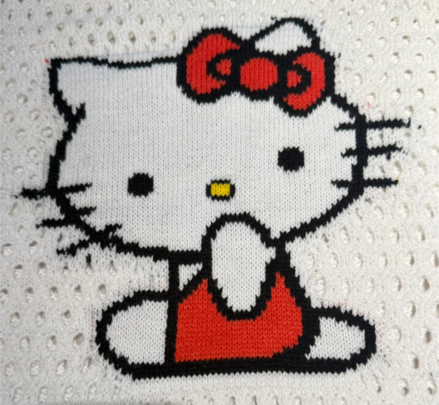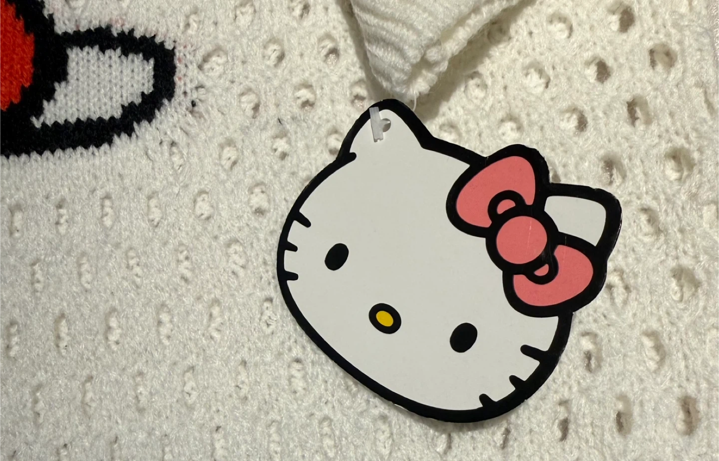 Beautiful white crochet-style knit with a large Hello Kitty face on the front.