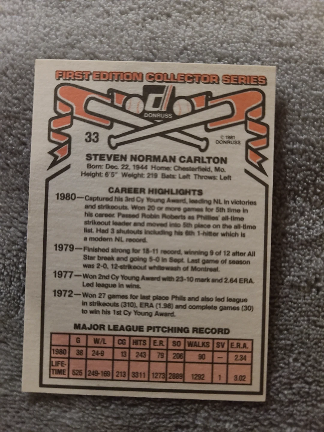 Donruss First Edition Collector Series baseball card featuring pitcher Steve Carlton. Card number 33, dated 1981. Includes his career highlights and major league pitching record.