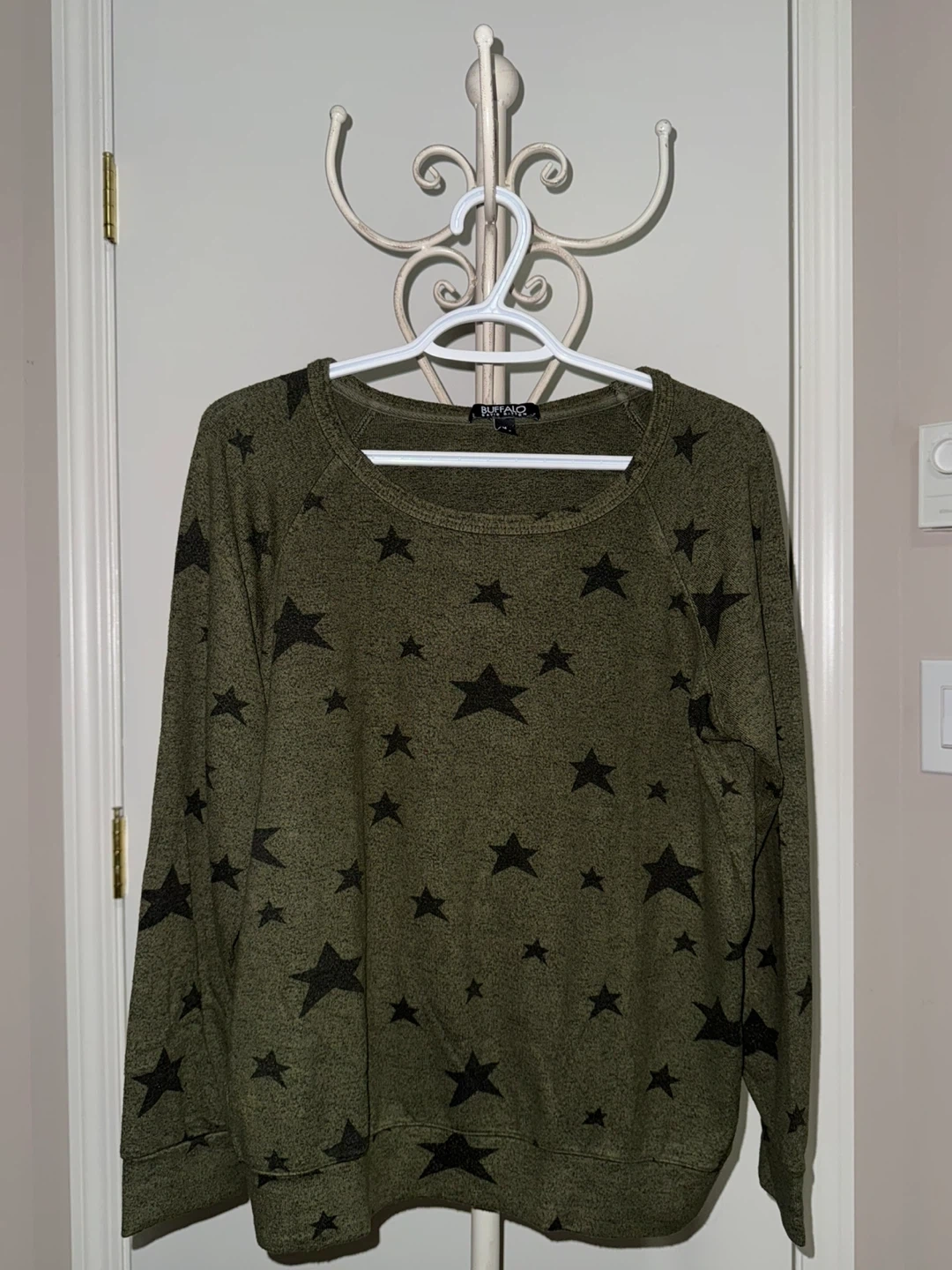This Buffalo David Bitton sweatshirt features a cute all-over black star print on a green marled background. It's a cozy knit with long sleeves and a crew neck. Soft material!