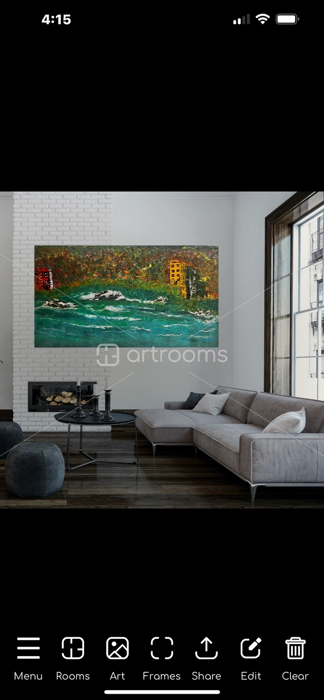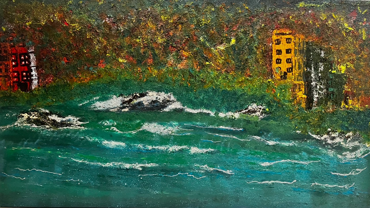 A painted canvas with a scene of a river. The top of the painting is filled with a forested area with a few buildings peeking through the trees. The bottom of the painting is mostly water with a hint of rocks and whitecaps on the water.