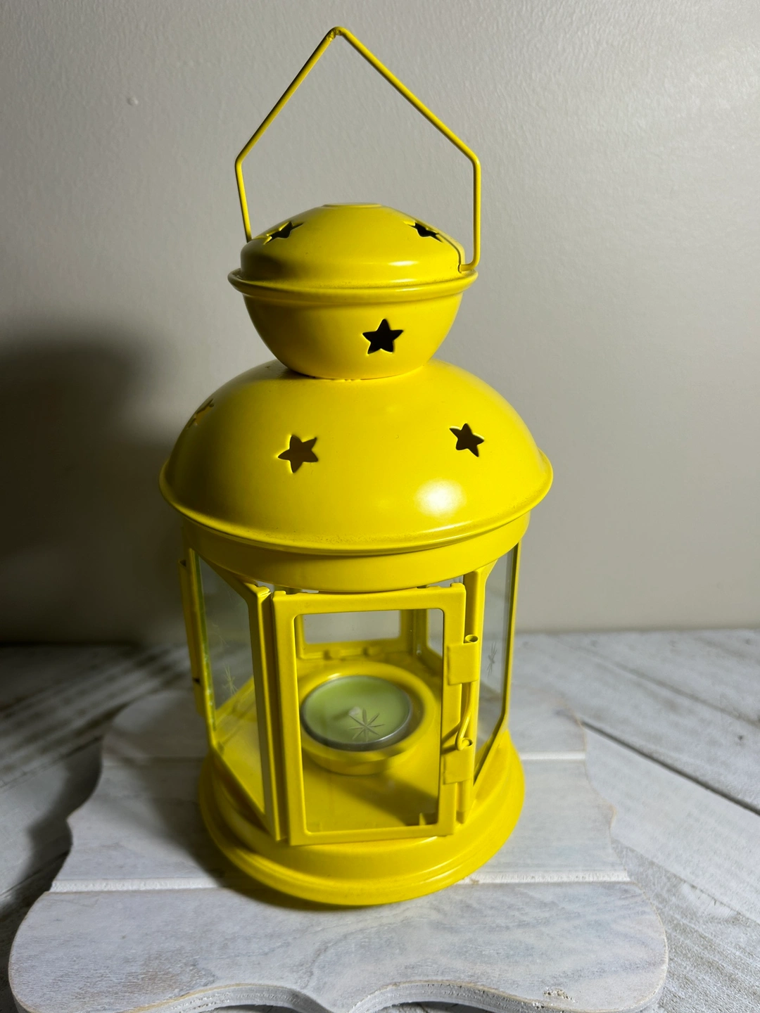 Metal lantern with glass panels and star cutouts. It has a handle on the top for easy carrying. The lantern comes with a small tealight candle.