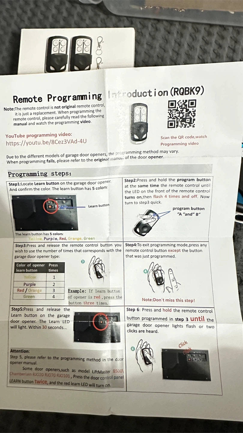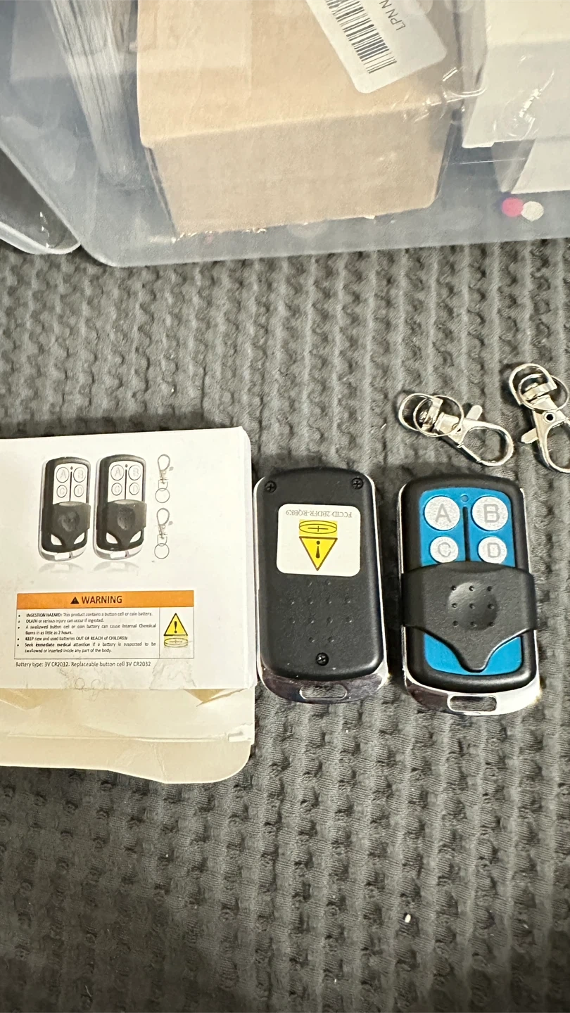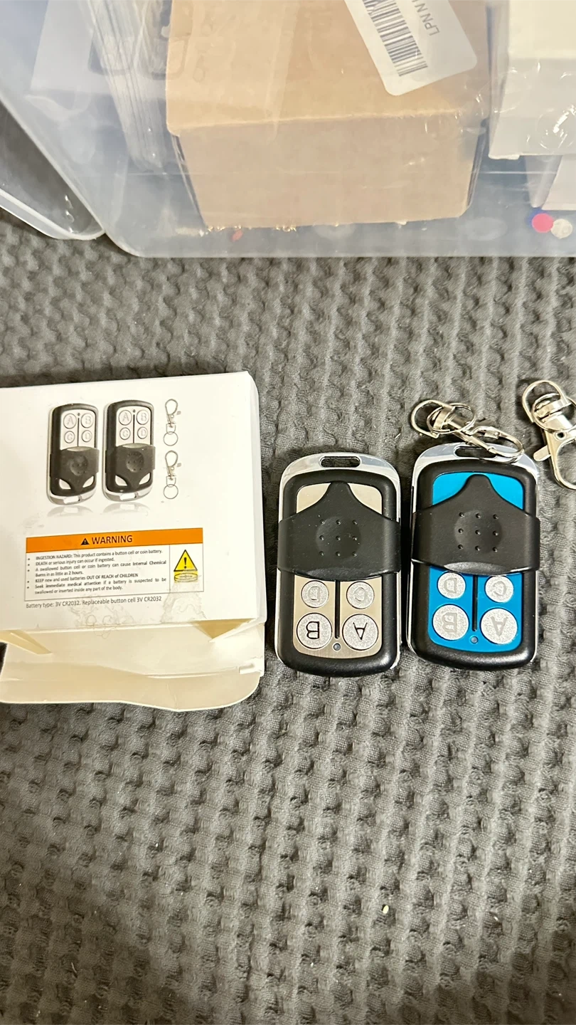 Two universal garage door remote key fobs with keychains. Easy to program and use for your garage door opener. Replacement button cells are CR2032.