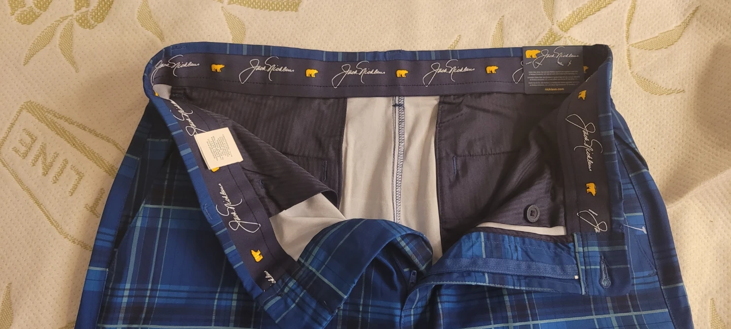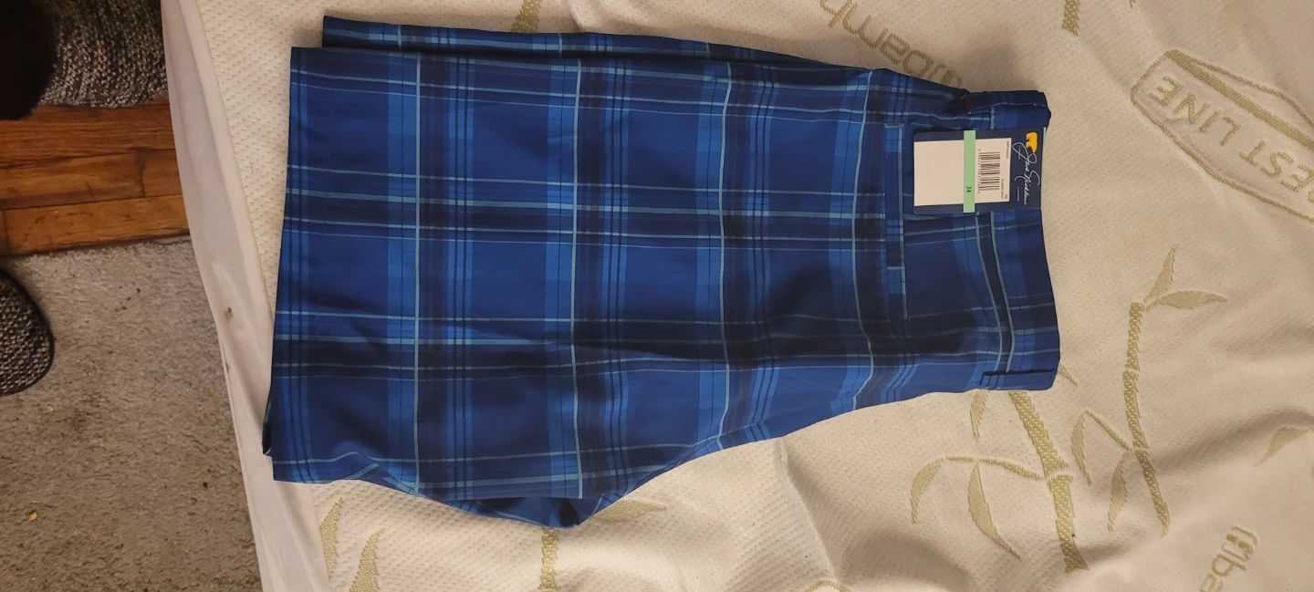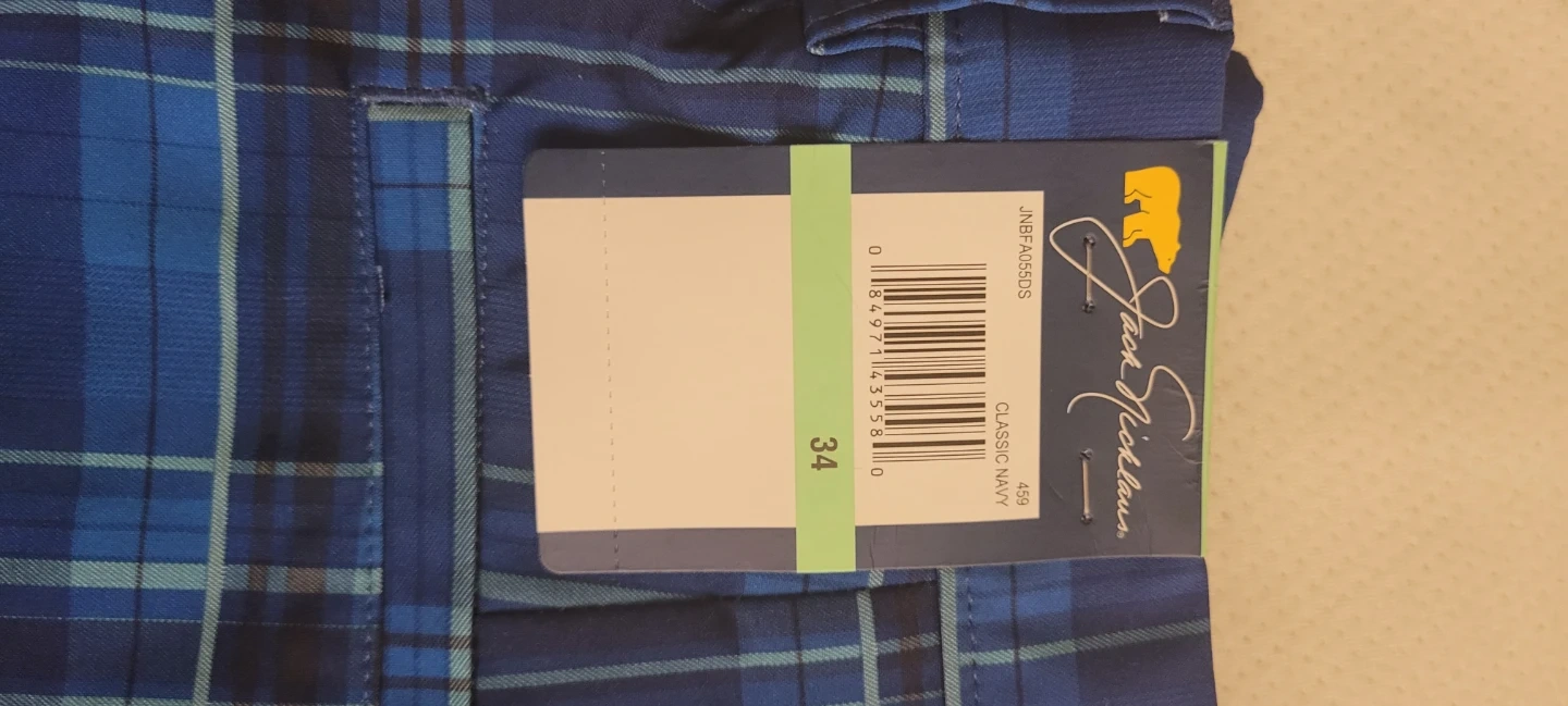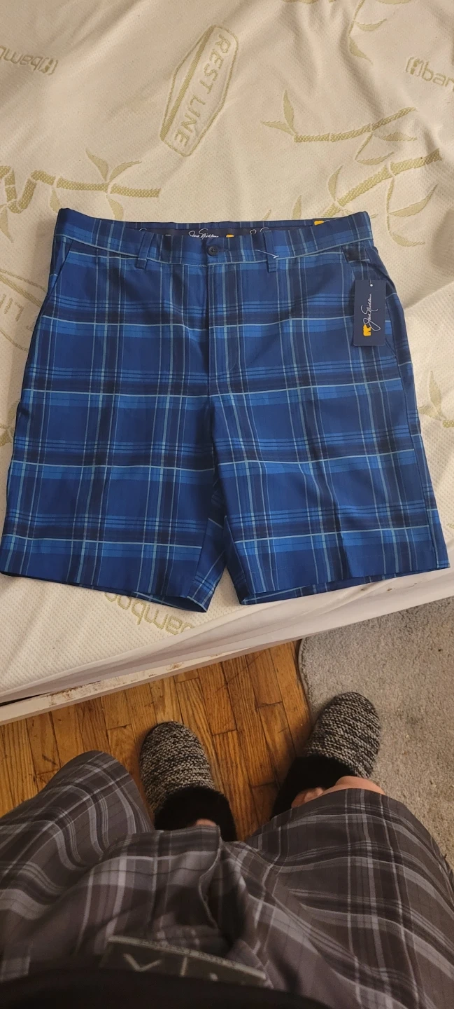 Men's Jack Nicklaus shorts in a classic navy plaid pattern. Size 34 waist. These shorts feature a comfortable fit suitable for everyday wear or a round of golf.