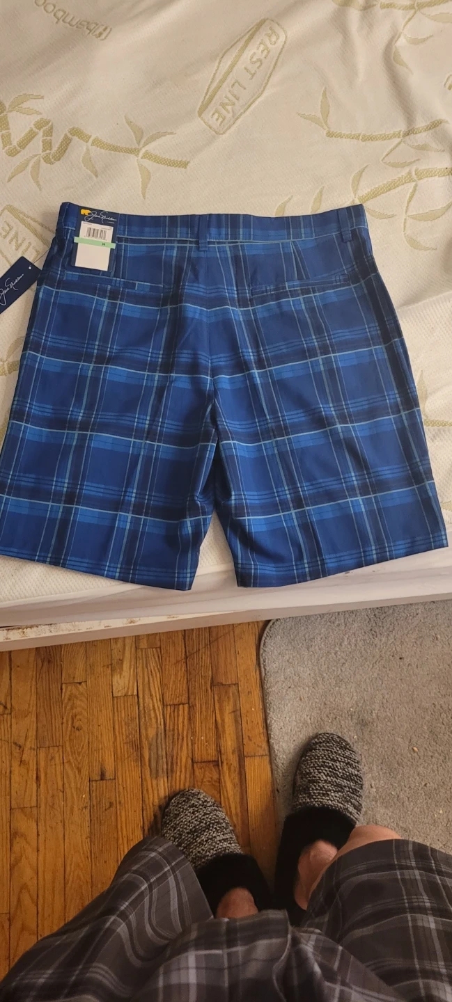 Men's Jack Nicklaus shorts in a classic navy plaid pattern. Size 34 waist. These shorts feature a comfortable fit suitable for everyday wear or a round of golf.