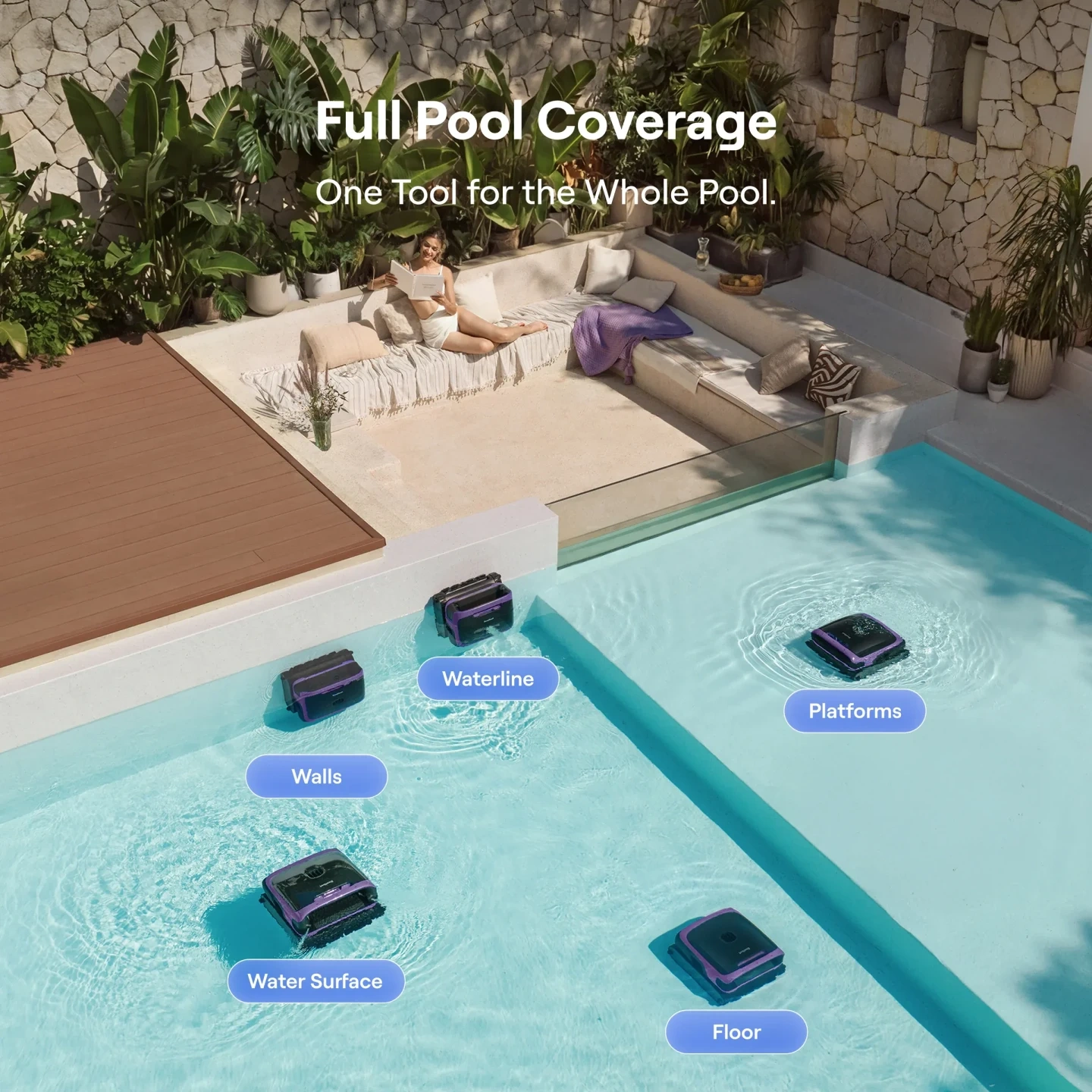 Complete 4‑Zone + Platform Coverage — Cleans surface, floor, walls, waterline, and shallow platforms as low as 8 inches.