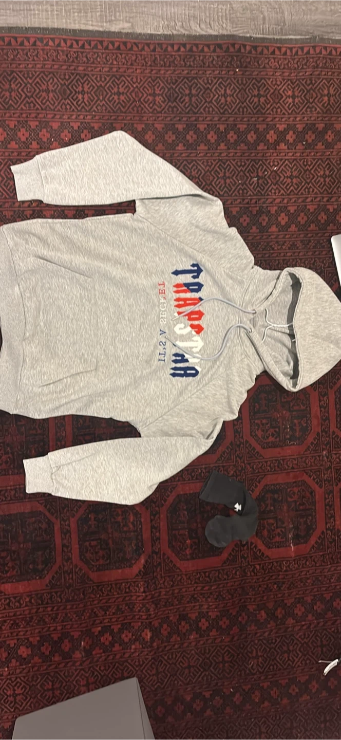 Selling a Trapstar hoodie in grey, size large. It's in great condition and ready for a new owner!