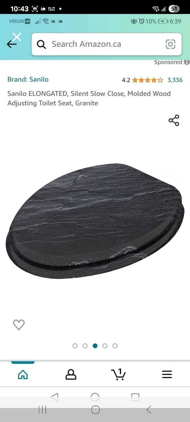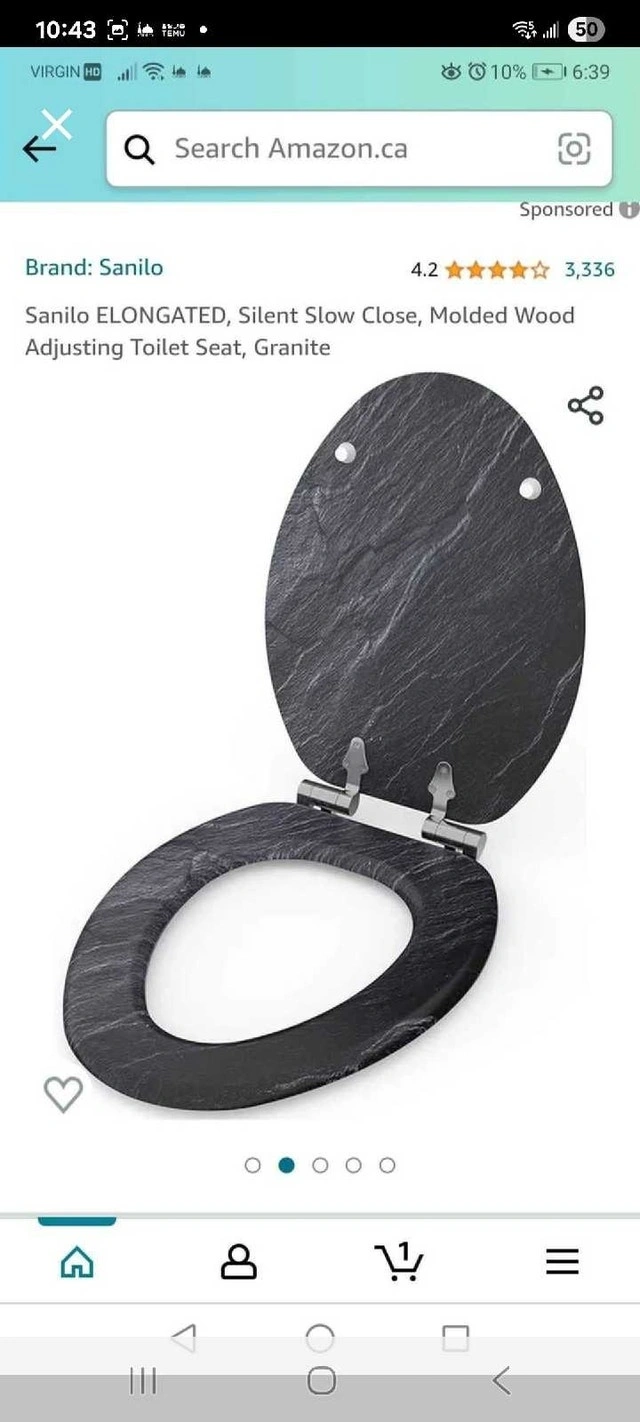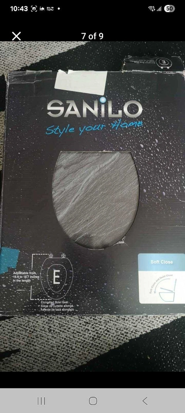 Spruce up your bathroom with this Sanilo elongated toilet seat, featuring a stylish granite design! It has a silent slow-close mechanism for added convenience. The molded wood construction ensures durability and comfort. Specifications: Brand: Sanilo, Shape: Elongated, Material: Molded Wood, Color: Granite, Features: Silent Slow Close, Adjustable Hinges. Condition: New. Cash accepted.