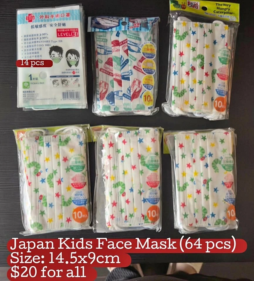 64 kids face masks from Japan. Size: 14.5x9cm. $20 for all. Pickup at Matcha Cafe Maiko (next to Richmond Public Market). Cash or E-transfer only. No refund, no return, no exchange after sale. Please check the condition of the items yourself. Please arrive on time for pickup, thank you for your cooperation.
