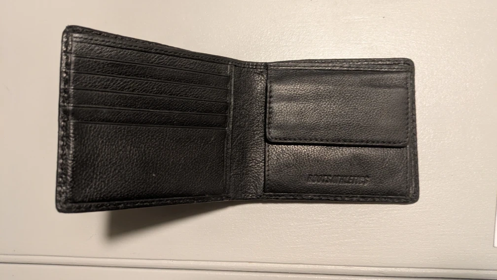 Black leather wallet by Roots Athletics with lots of space for cash, debit / credit / gift cards, and coins. Great condition.