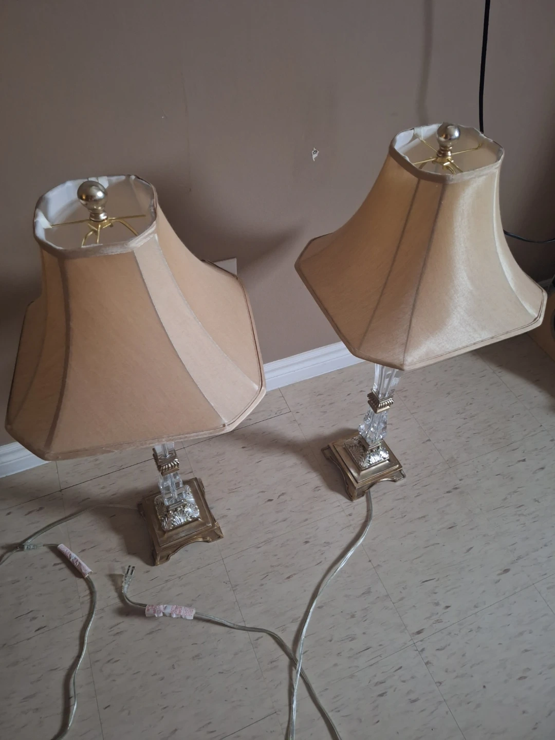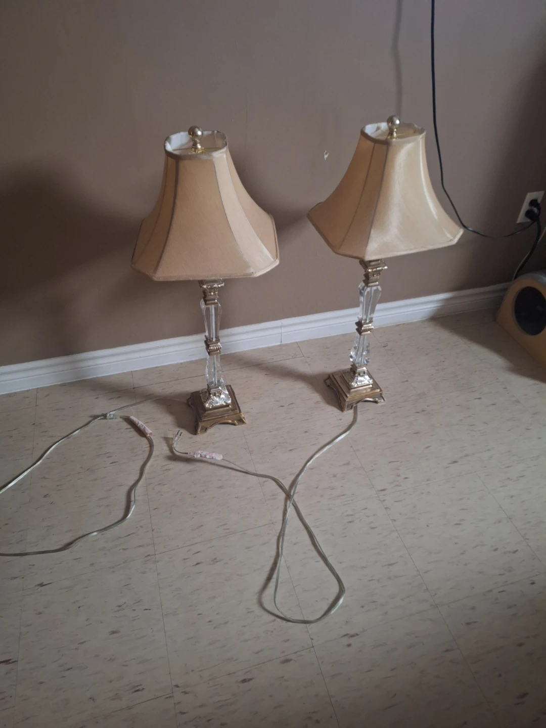 This is a set of two elegant table lamps. They feature clear crystal accents and a brass base with ornate detailing. The lampshades are a classic beige colour. Perfect for adding a touch of sophistication to any room's decor!