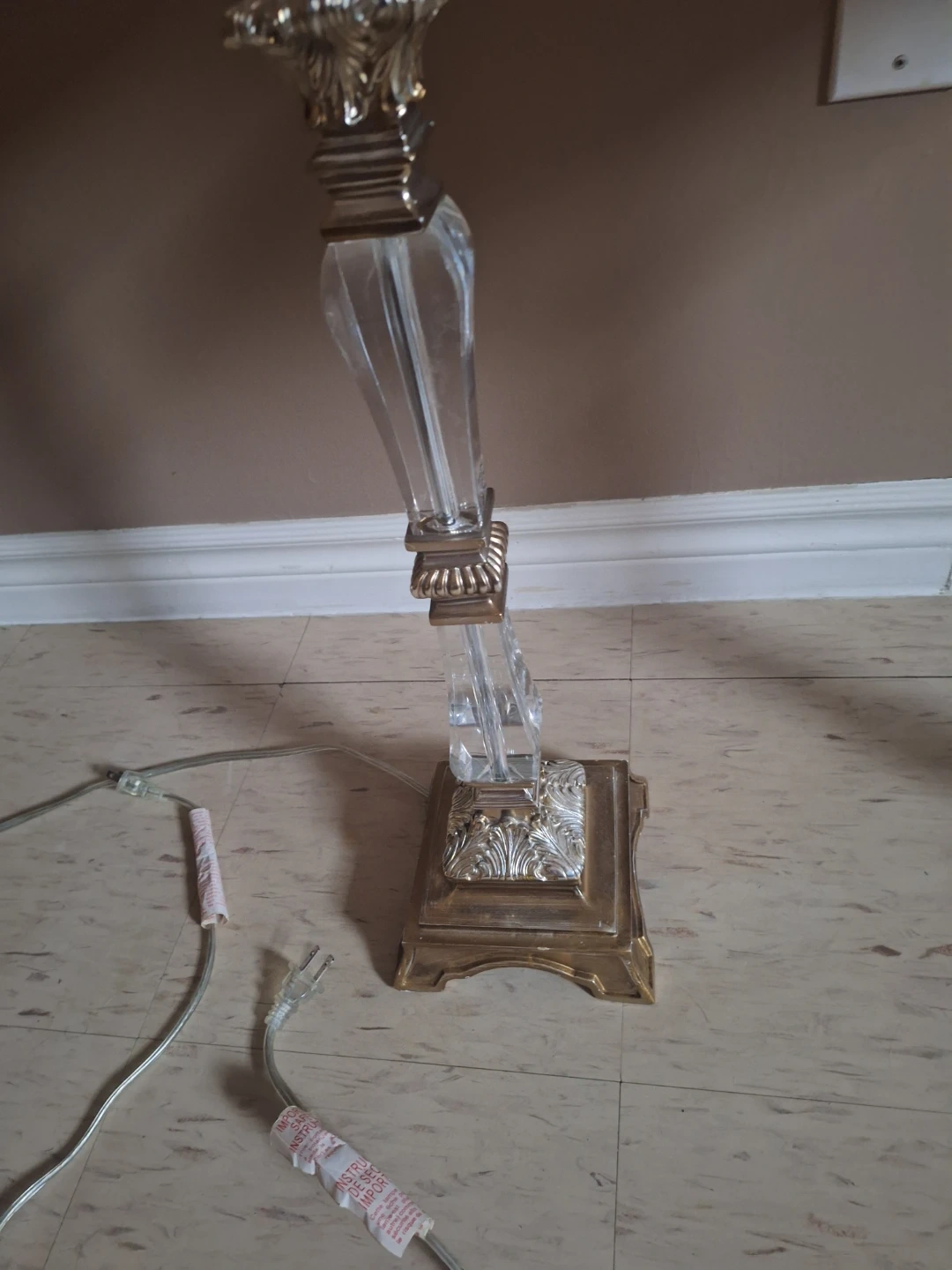 This is a set of two elegant table lamps. They feature clear crystal accents and a brass base with ornate detailing. The lampshades are a classic beige colour. Perfect for adding a touch of sophistication to any room's decor!