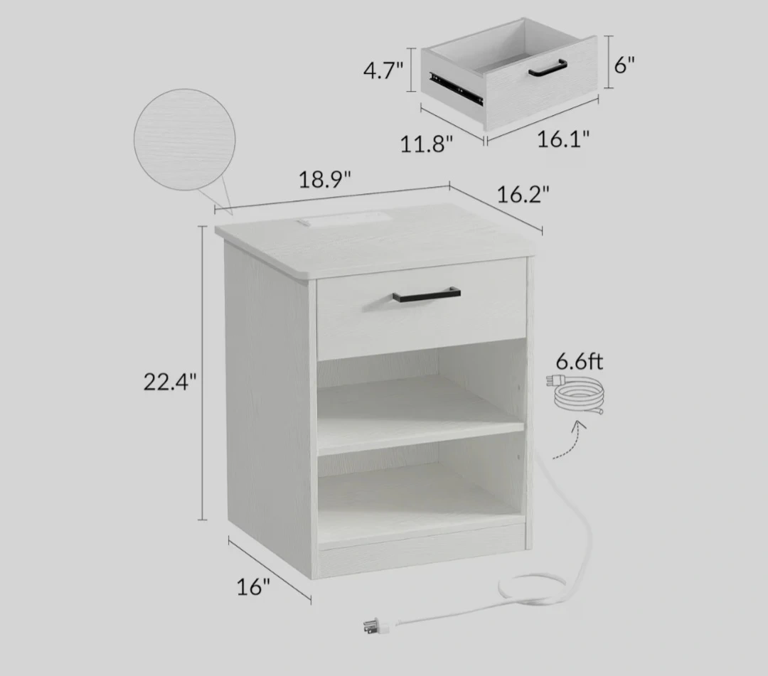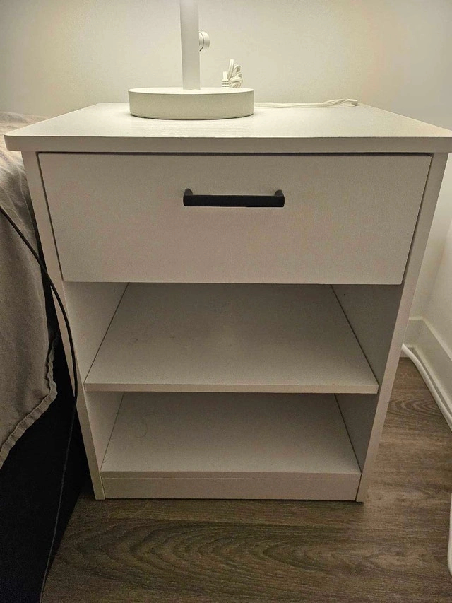 This is a drawer, open shelf, and an electrical outlet with USB ports on the back. It's in used, but good condition. It’s perfect for keeping your bedside essentials within easy reach. Drawer for storage, open shelf for display, built-in electrical outlet and USB ports. Cash accepted.