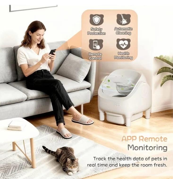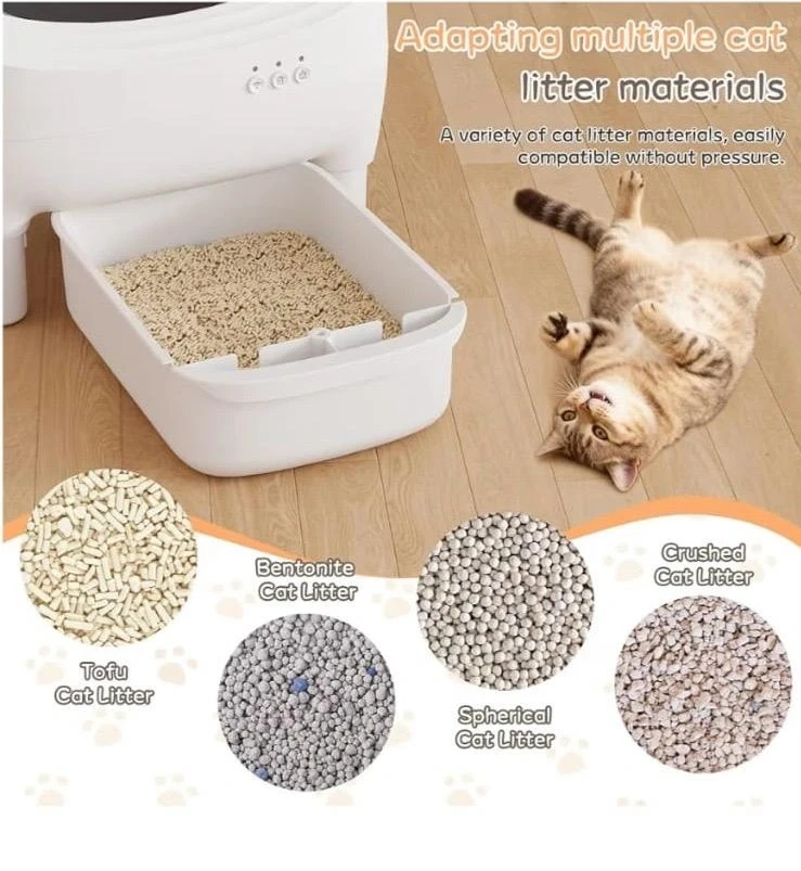 This automatic litter box offers multiple safety protections for your cat. It supports various cat litter materials like Tofu, Bentonite, Spherical, and Crushed cat litter. The device also features app remote monitoring to track your pet's health data.