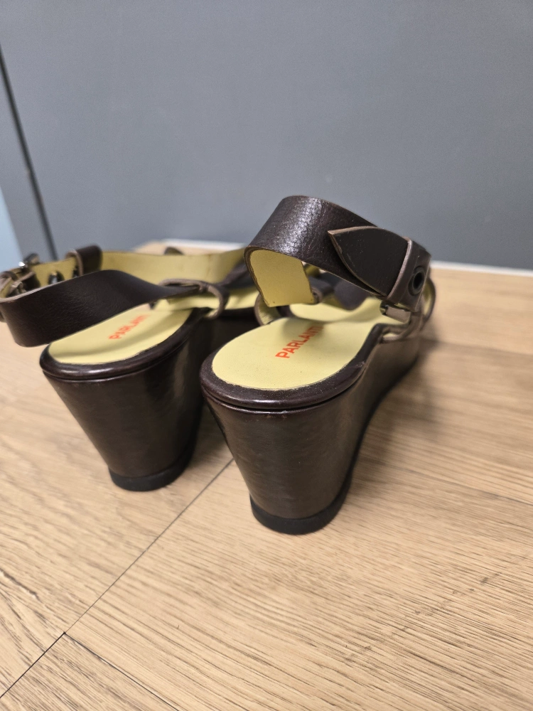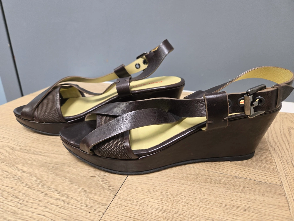 These Parlanti wedge sandals are a stylish addition to any wardrobe! They feature a unique strap design and a comfortable wedge heel. The colour is a lovely brown. Perfect for dressing up or down!