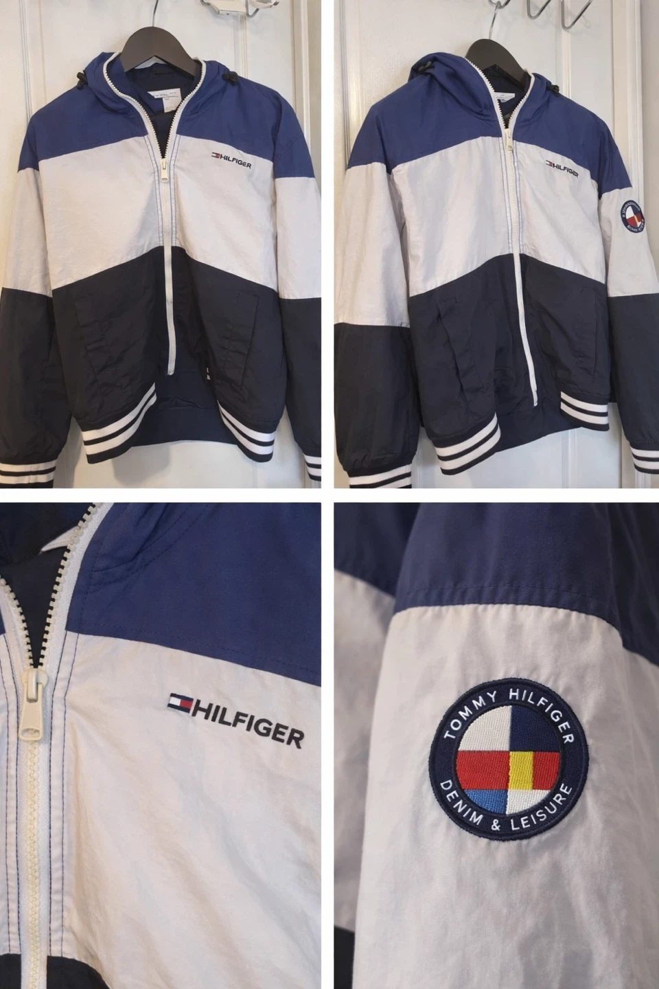 A Tommy Hilfiger windbreaker jacket with a colour block design. It features a full zip closure and a hood. The jacket has the Tommy Hilfiger logo on the chest and a "Denim & Leisure" patch on the sleeve.
