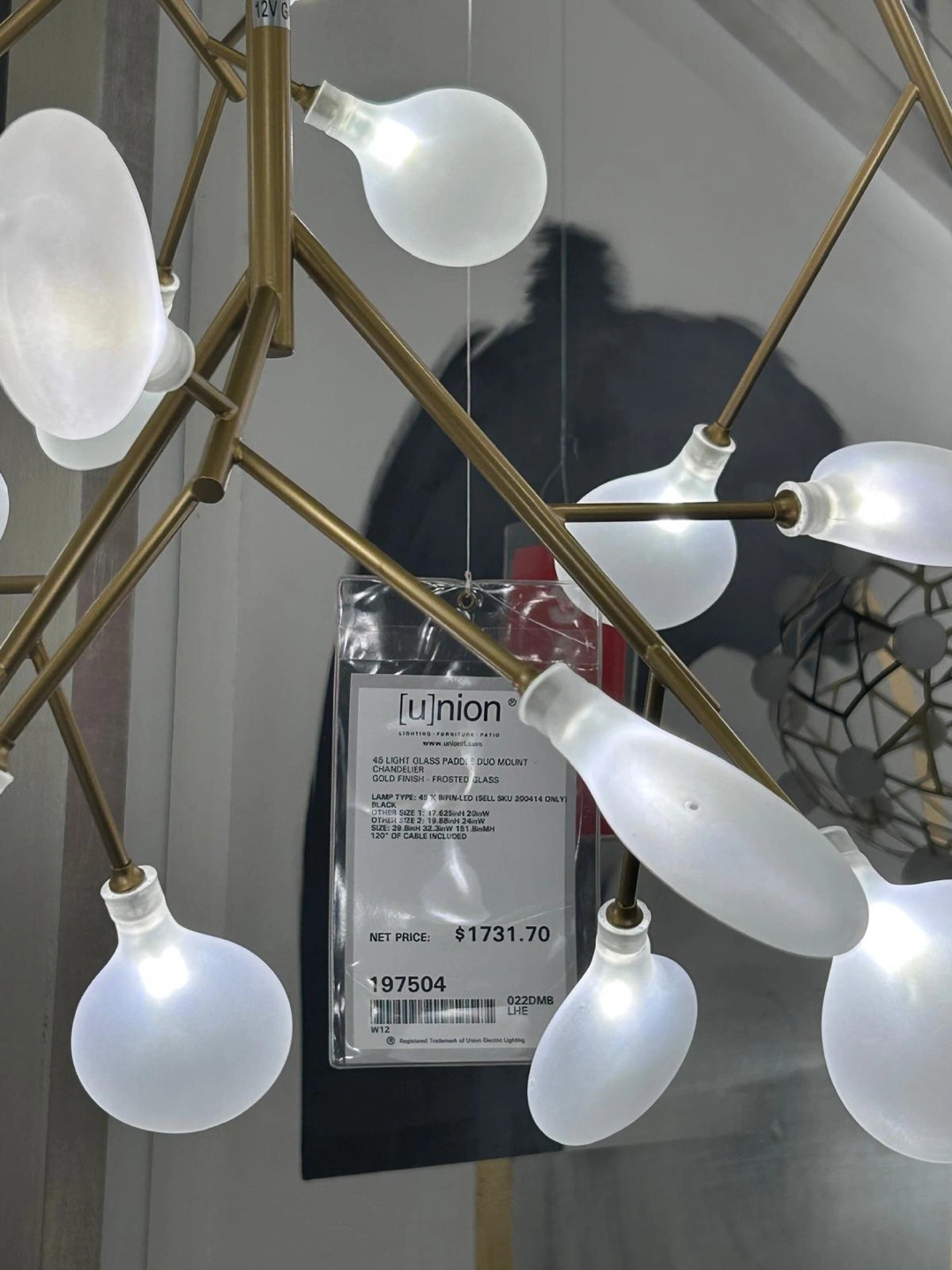 This is a stunning Union Lighting chandelier featuring 45 light glass pods. The metal frame has a beautiful gold finish, complemented by frosted glass pods. The original net price was $1731.70. It will add a touch of elegance to any room! Move out sale