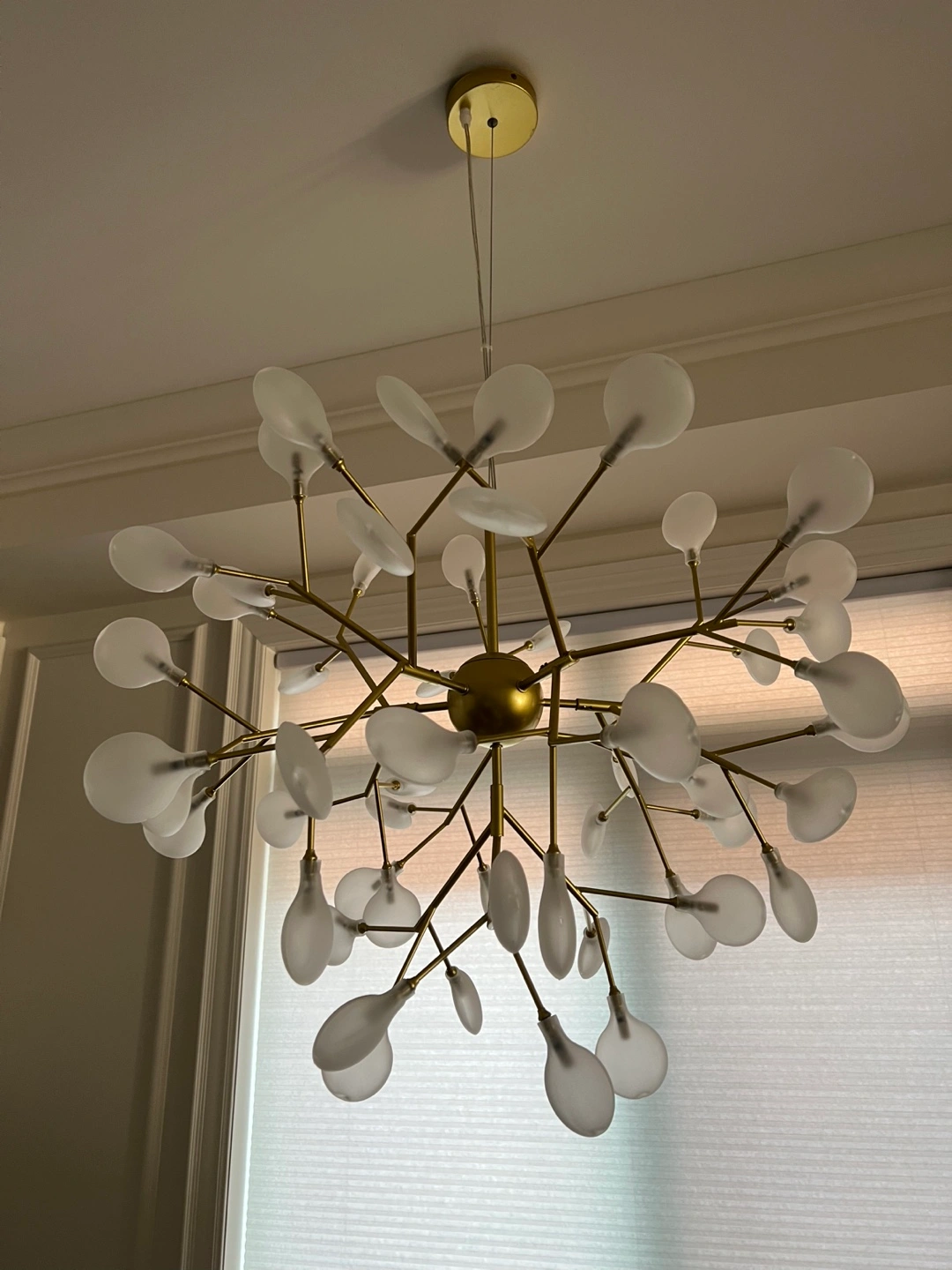 This is a stunning Union Lighting chandelier featuring 45 light glass pods. The metal frame has a beautiful gold finish, complemented by frosted glass pods. The original net price was $1731.70. It will add a touch of elegance to any room! Move out sale