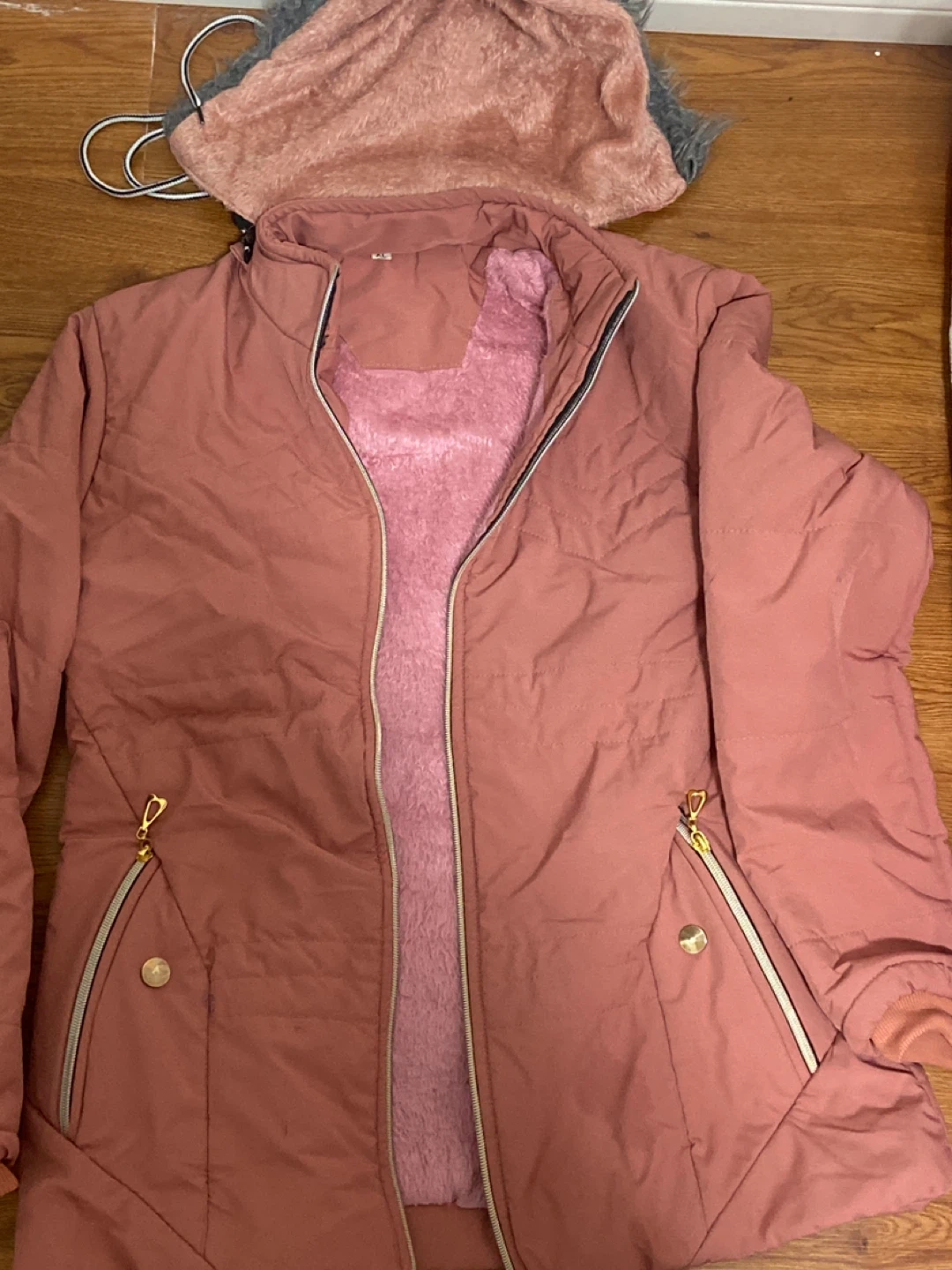 This pink hooded jacket is lined with soft faux fur for extra warmth. It features zippered pockets and a full zip closure. The hood has a grey faux fur trim.