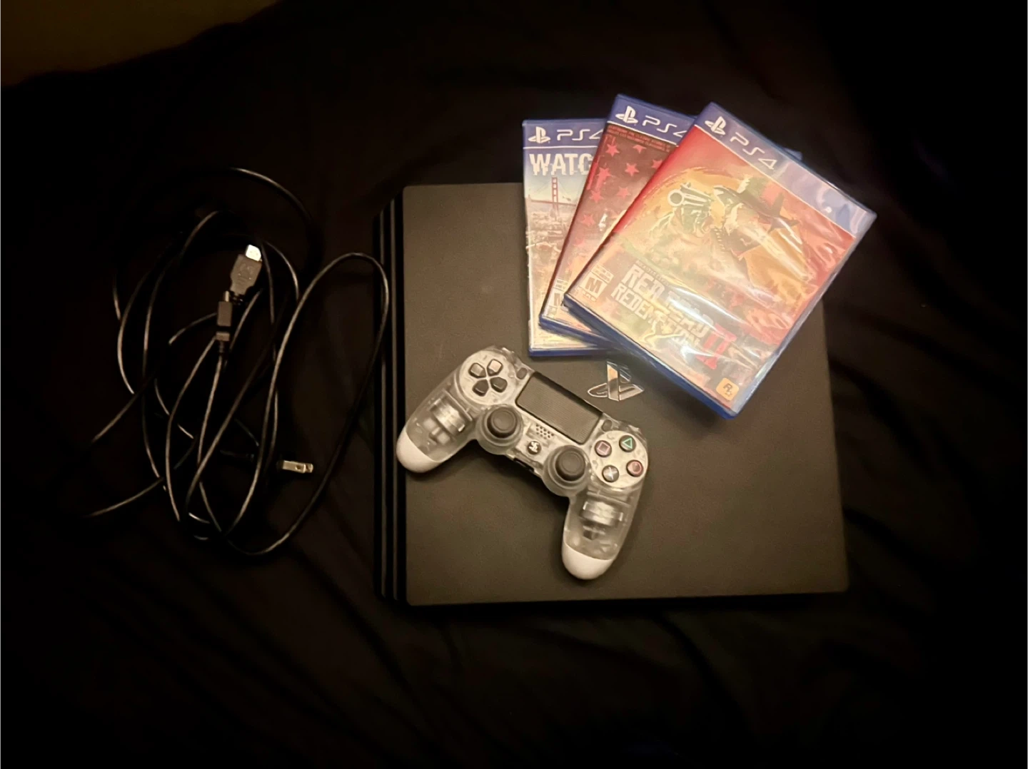 Includes a PlayStation 4 Pro console, a clear special edition controller, and three games: Watch Dogs 2, Red Dead Redemption 2, and Red Dead Redemption 1. Also comes with necessary power and HDMI cables.