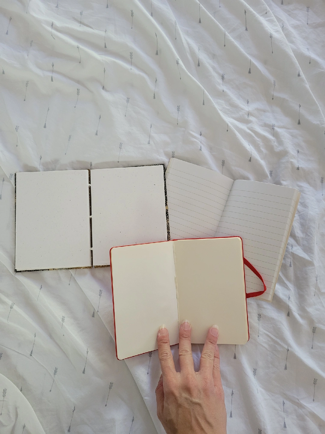 The two top ones have never been used. The red moleskine has ~7 pages ripped out. Second photo shows lined vs unlined. They're small, like palm-sized. Perfect for stashing in a bag or pocket!