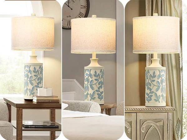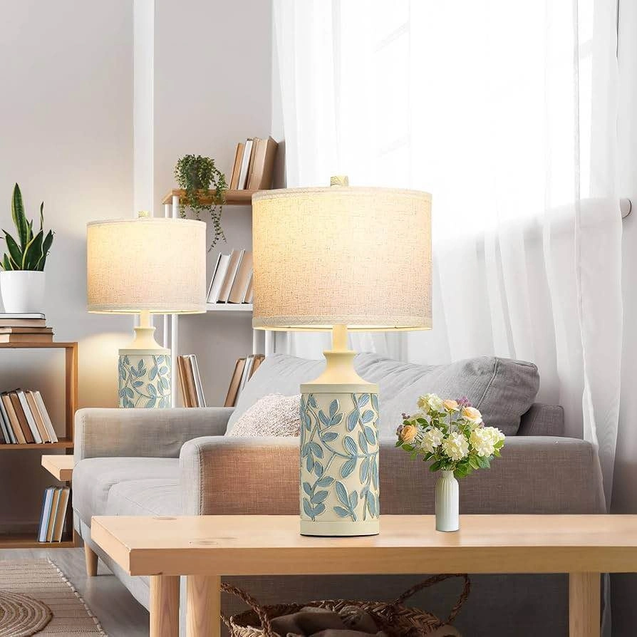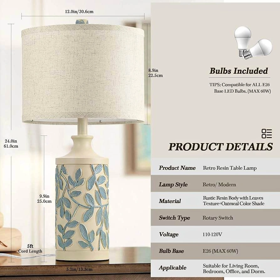 Set of 2 farmhouse cream table lamps, perfect for a bedroom nightstand or living room end table. These rustic lamps feature a vintage design with a resin body and offer 3 color temperatures. Bulbs are included.