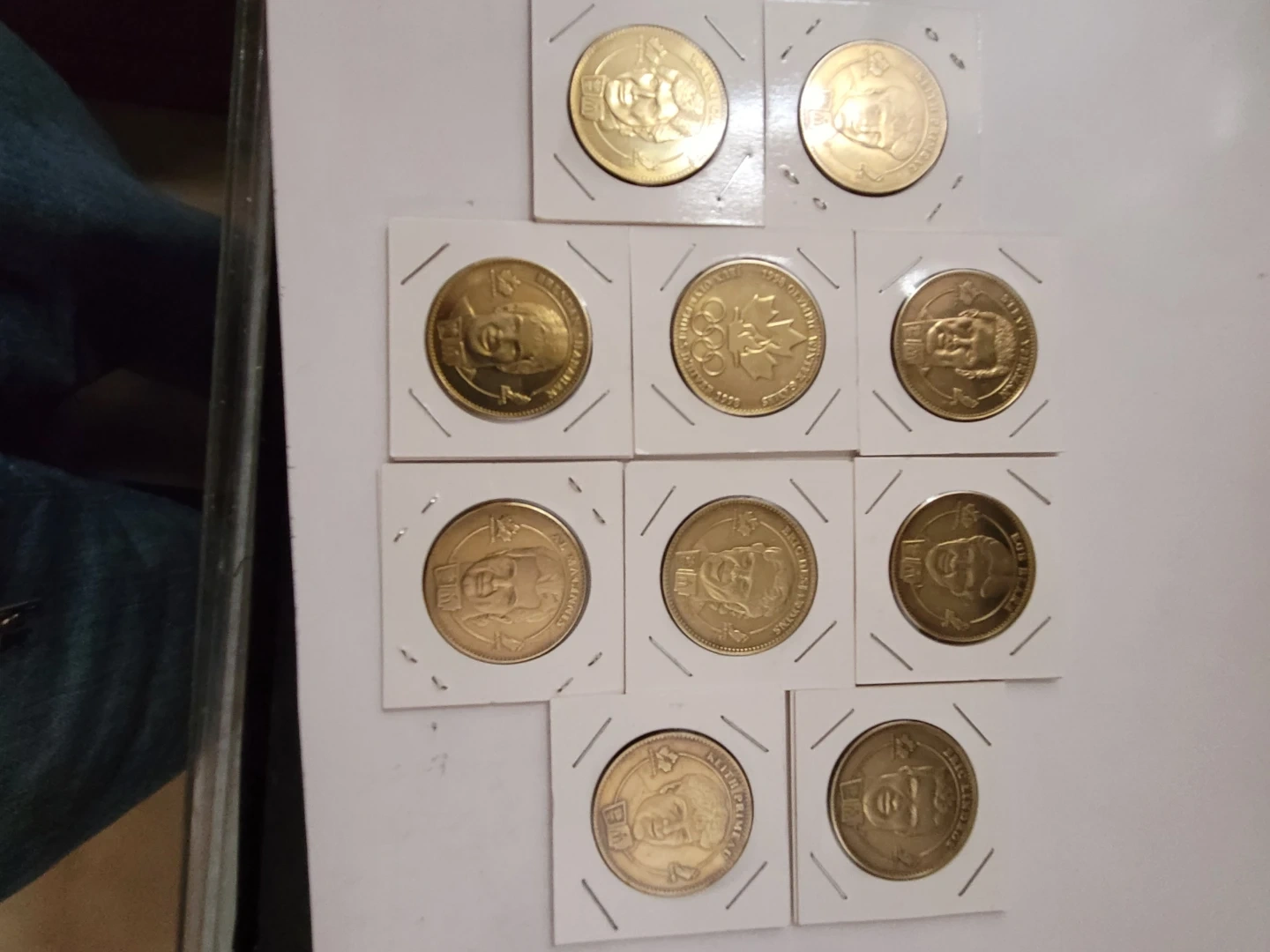 This lot includes nine commemorative coins. One coin features the 1988 Calgary Winter Olympics logo with a maple leaf. The others display portraits of various figures. Coin material is gold-toned metal.