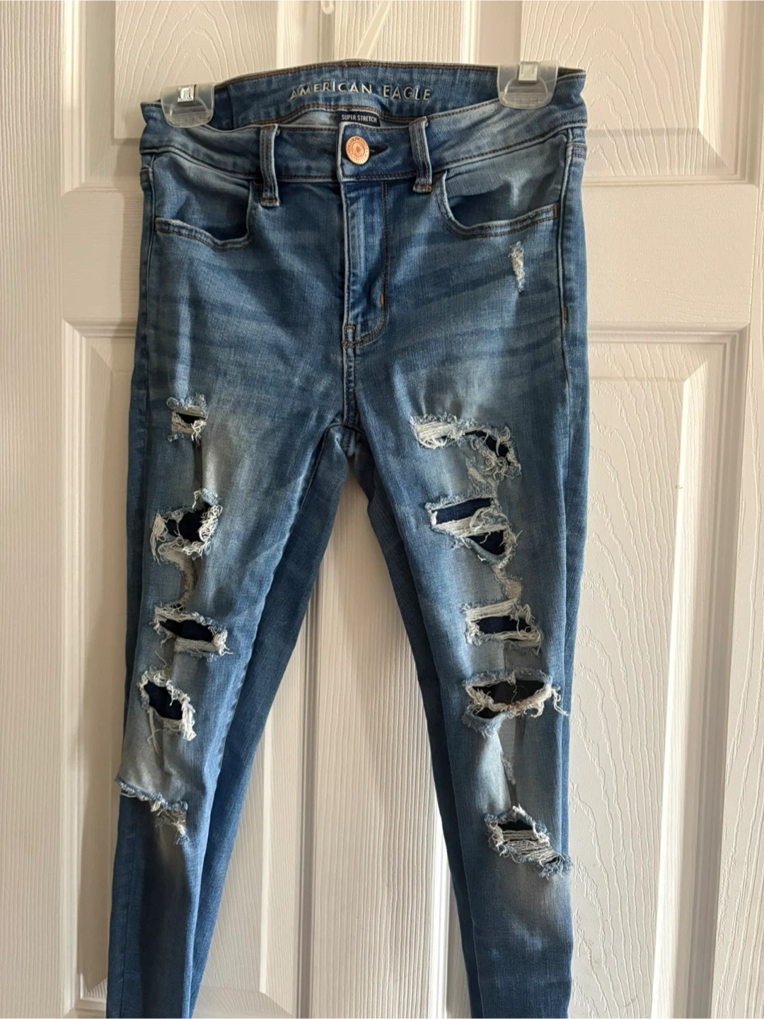 American Eagle jeans are a size 2 Short. made with 92% cotton, 7% polyester, and 1% elastane for comfort and stretch. Designed with a distressed, ripped look.