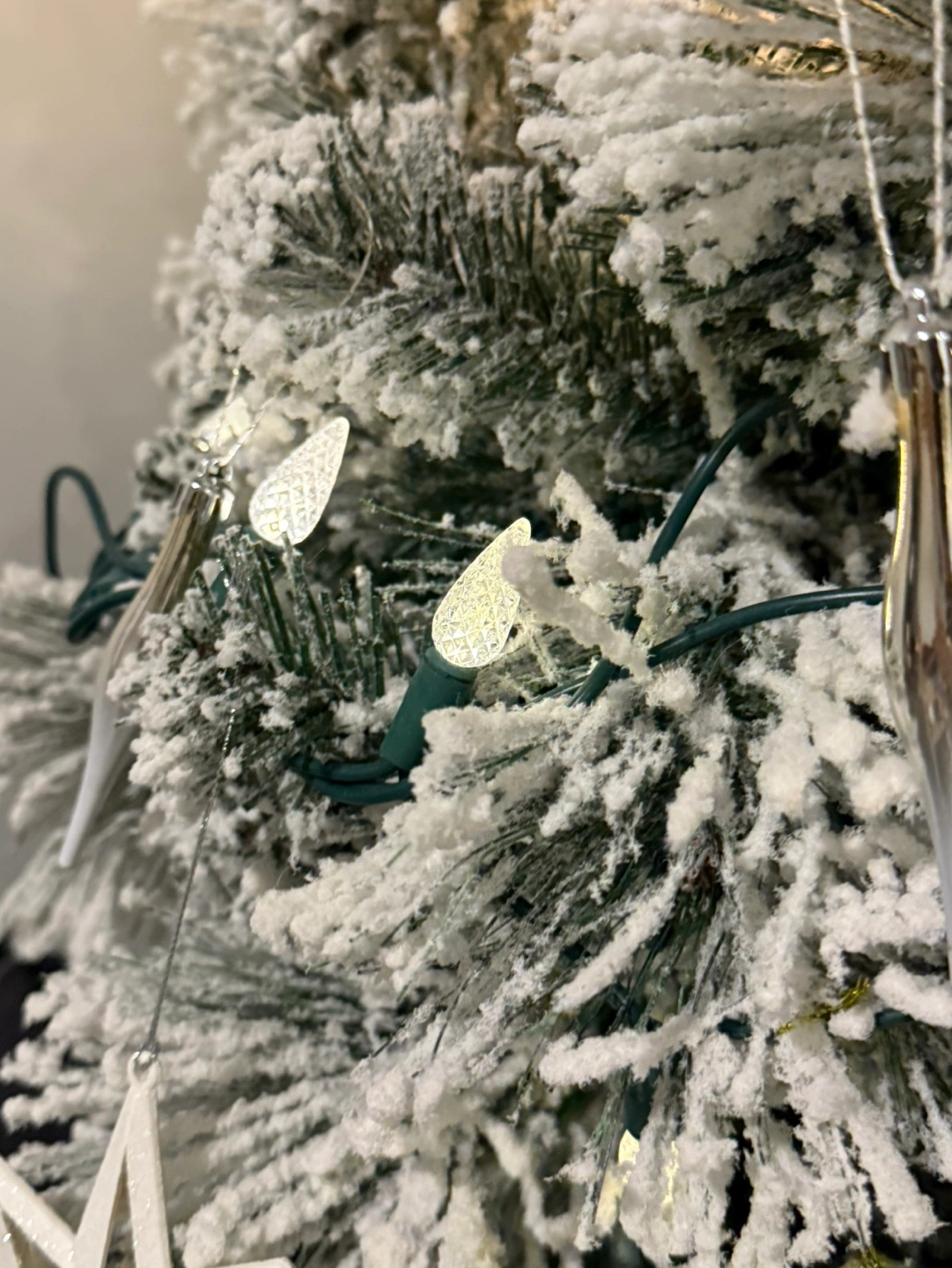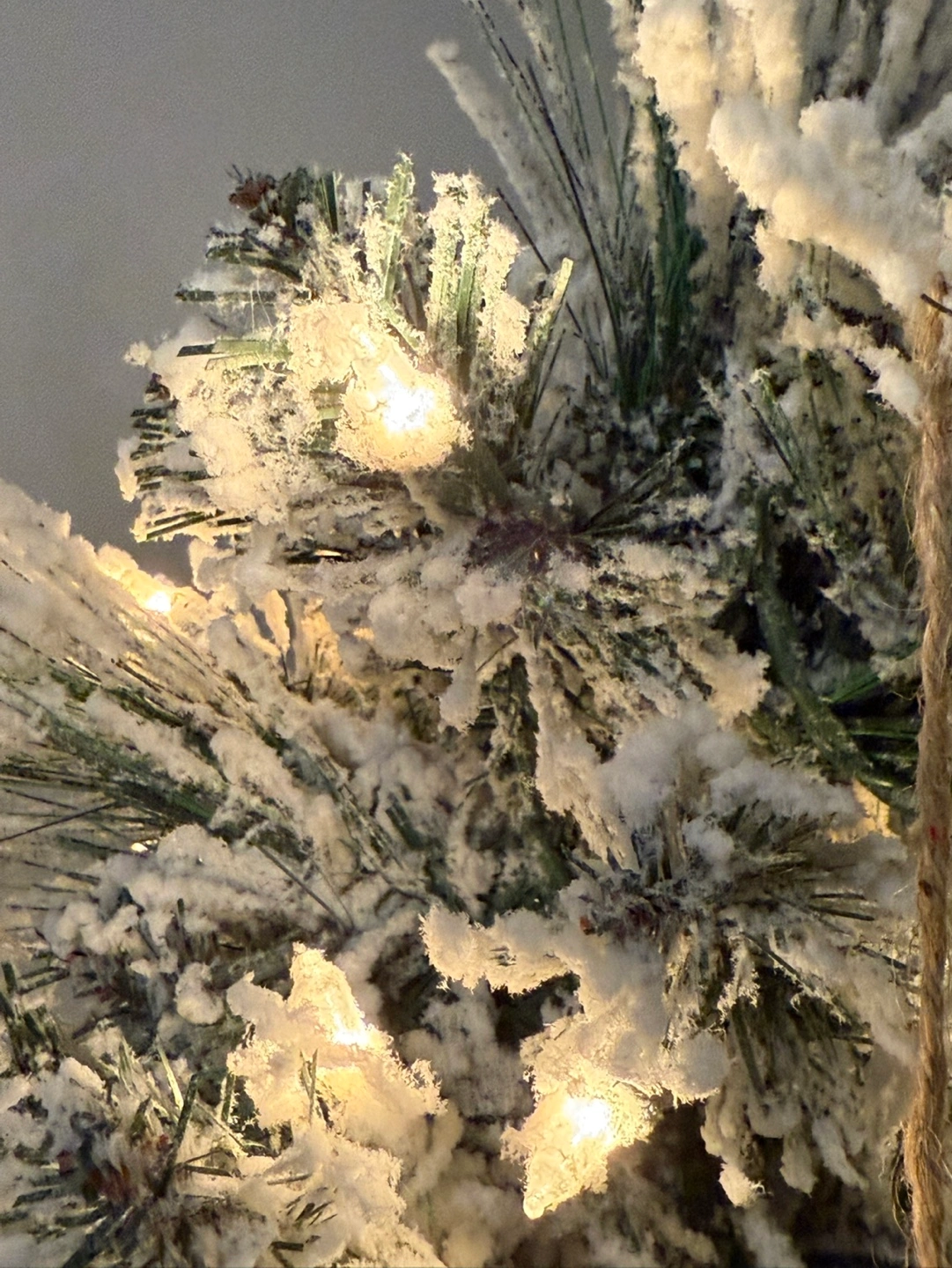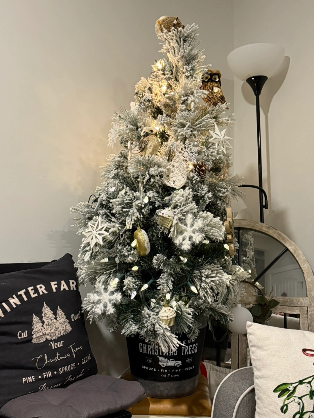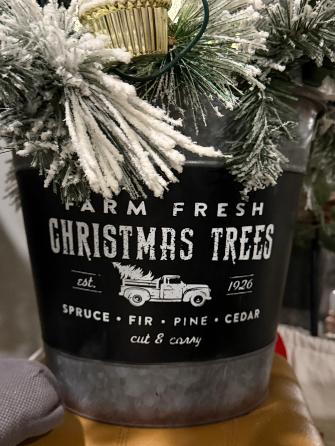Adorable mini artificial Christmas tree. Pre-lit with warm white lights, half of it is out so added another set of lights. Snow-flocked branches. Comes in a cute galvanized metal bucket. Perfect for tabletop or small space.