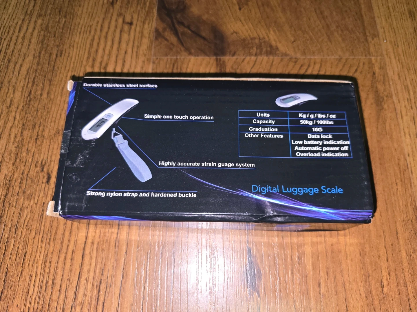 Durable stainless steel surface and a strong nylon strap. It has a capacity of 50kg/100lbs with a graduation of 10G. Other features include data lock, low battery indication, auto power off, and overload indication.