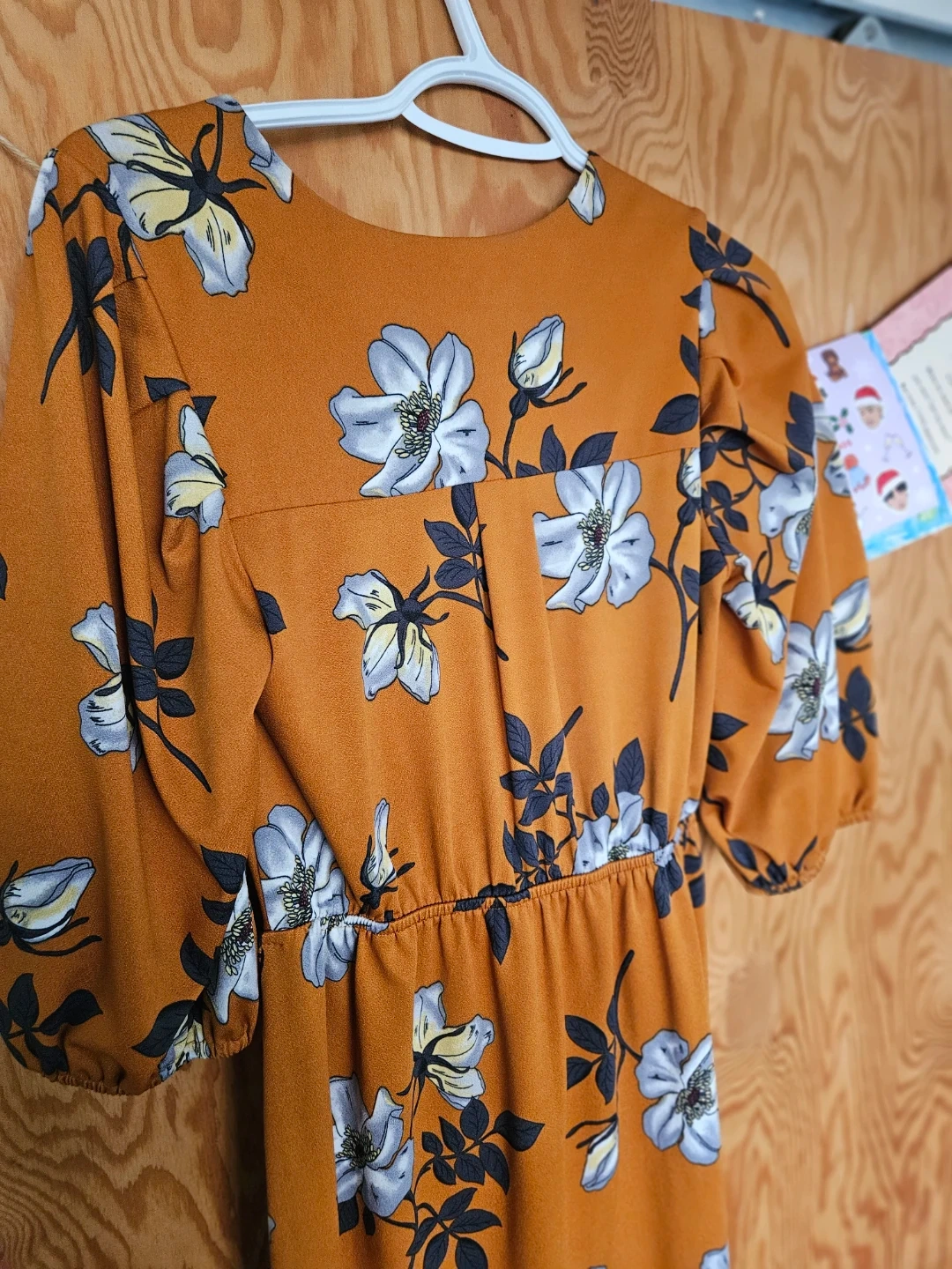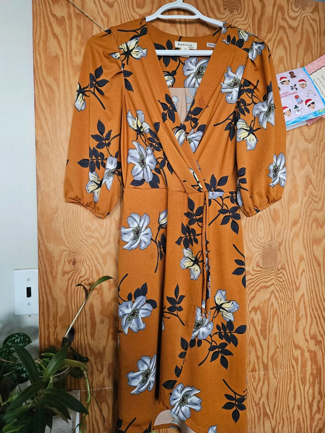 Brown floral wrap dress with puff sleeves. It's a size medium. This dress is perfect for a casual outing or a dressier event!