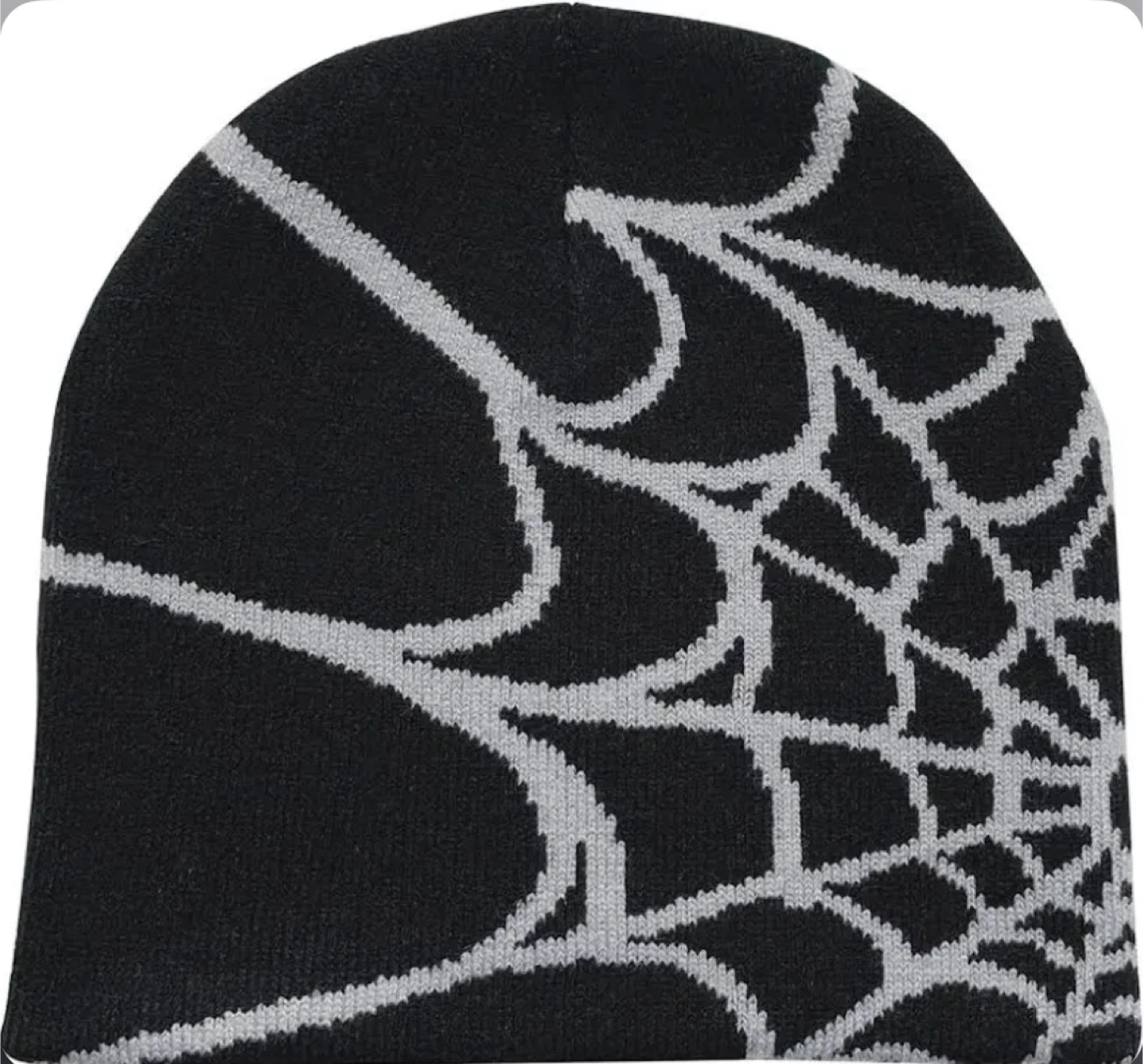 Selling a black beanie with a spiderweb design. It's in great condition and perfect for keeping your head warm during the colder months! The beanie is black with a grey spiderweb pattern.