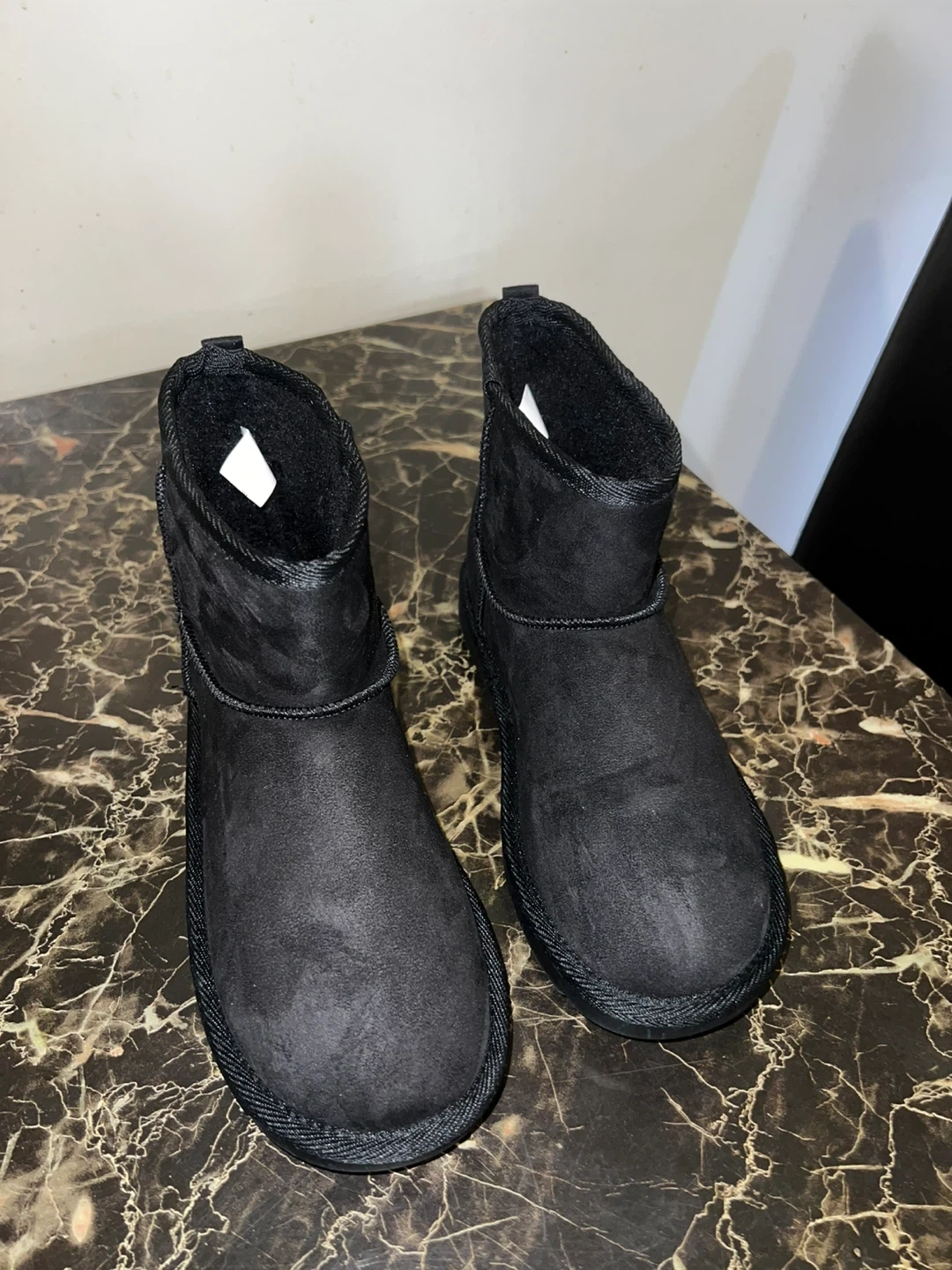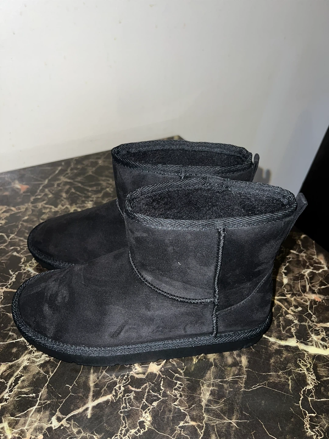 Size 6 Cozy black suede boots with a warm, fuzzy linong. These boots are perfect for keeping your feet toasty on chilly days. Slip them on for quick errands or casual wear!