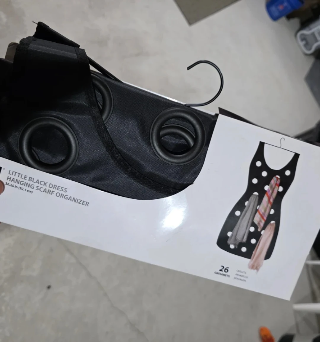 I'm selling a brand new Little Black Dress Hanging Scarf Organizer! It's perfect for keeping your thinner smaller scarves organized . It measures 36.25 inches (92.1 cm) and features 26 grommets.