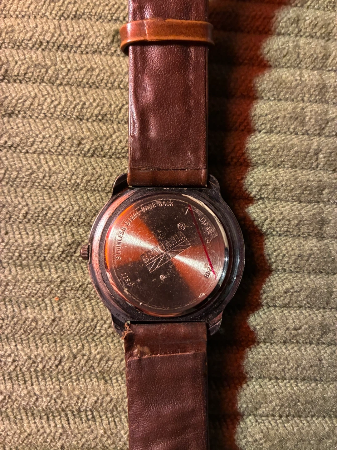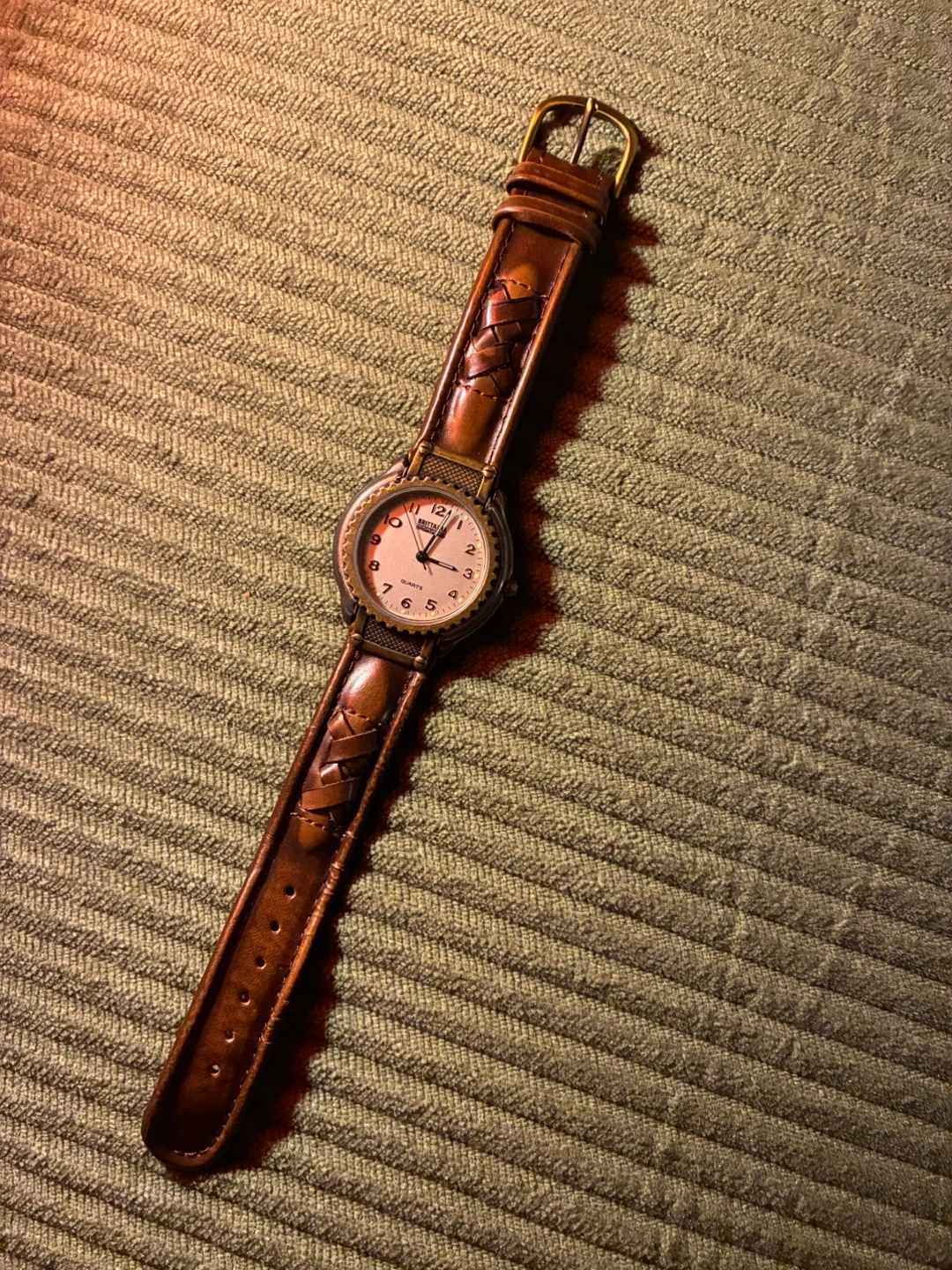 This is a Britannia quartz watch. It features a white face with a brown leather strap and a brass buckle. The strap has a braided detail.