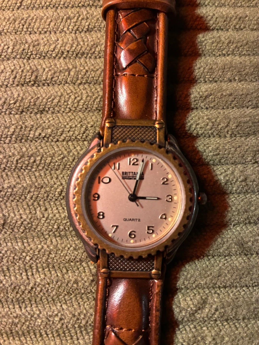 This is a Britannia quartz watch. It features a white face with a brown leather strap and a brass buckle. The strap has a braided detail.
