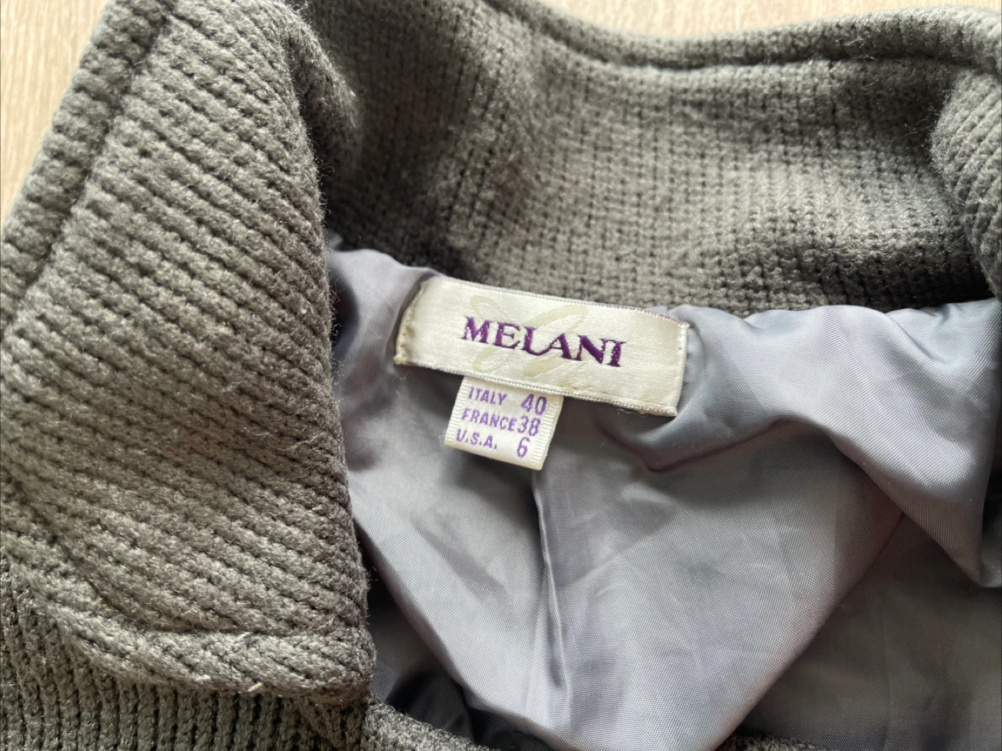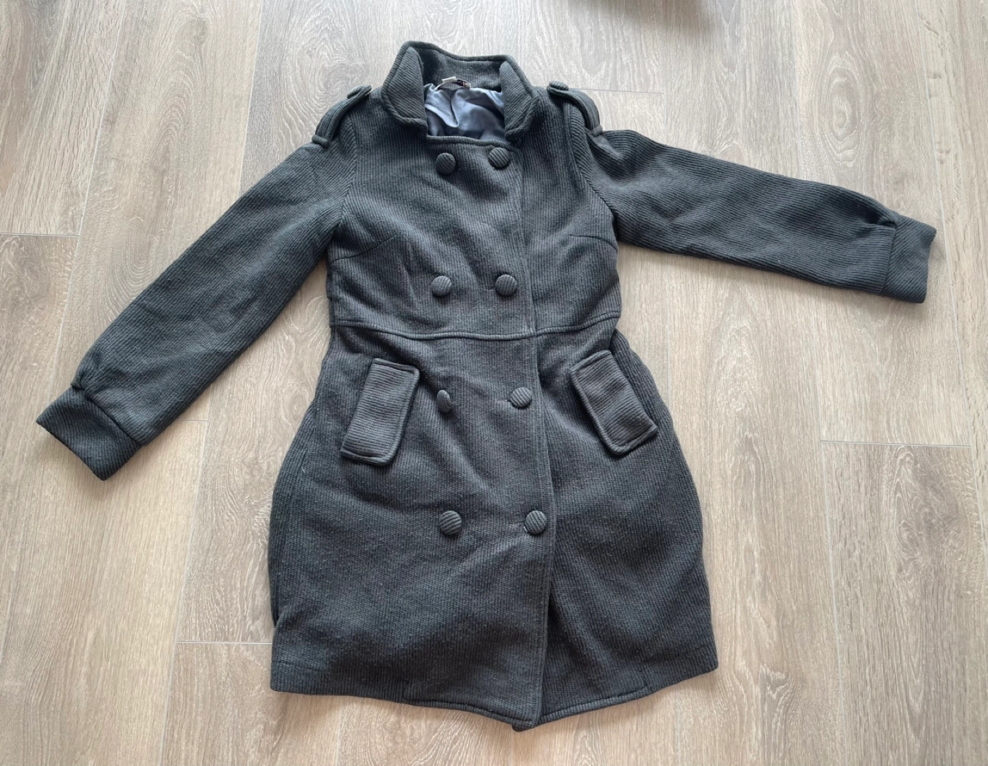 Dark grey ribbed peacoat. Double-breasted with buttons. Long sleeves. Two pockets. Balloon hem. Size 6 US.