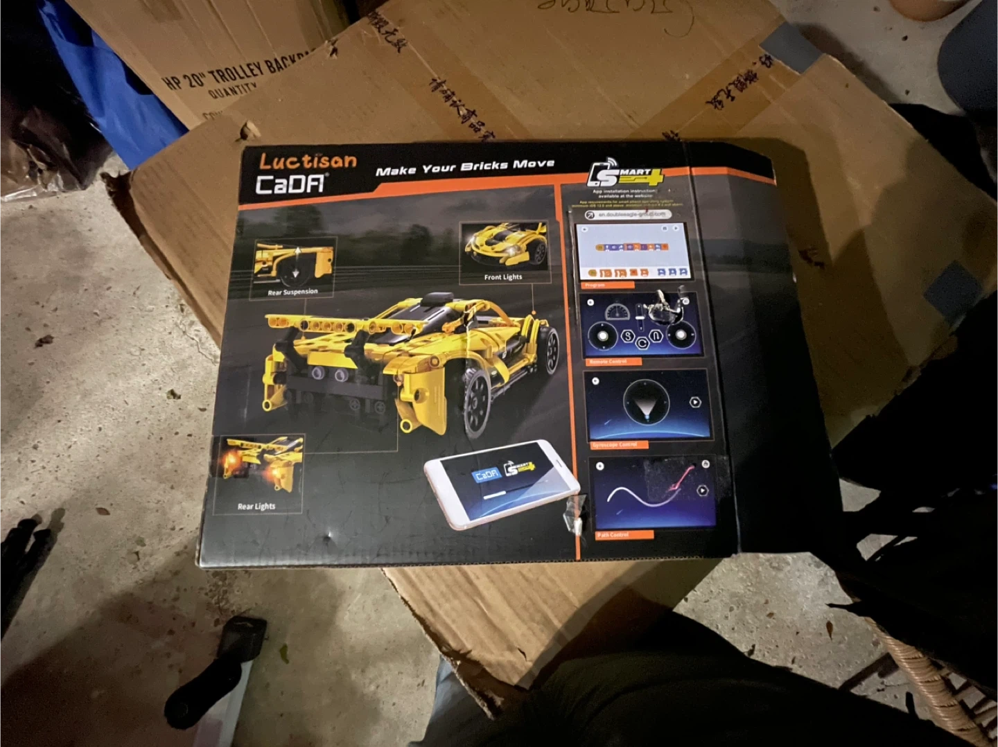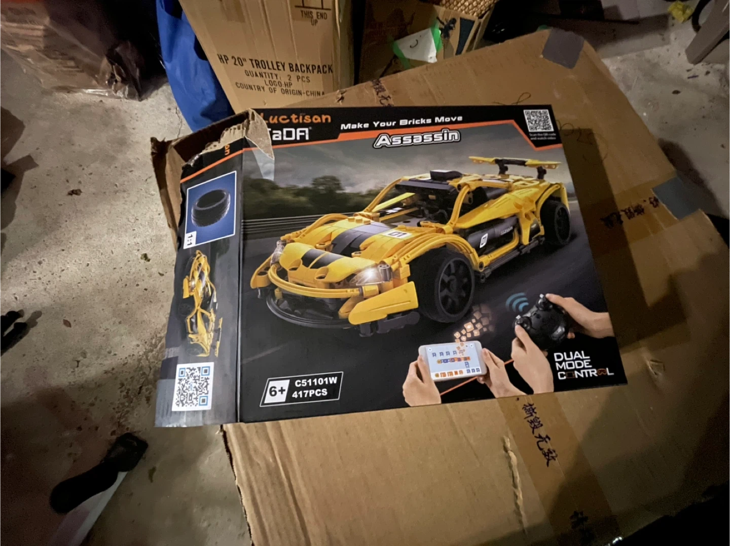 This Luctisan CaOA building block set features a yellow RC sports car with dual mode control. It includes 417 pieces and offers app-controlled and remote control options for movement. Rear suspension and lights are also present on the model. It's suitable for ages 6 and up.