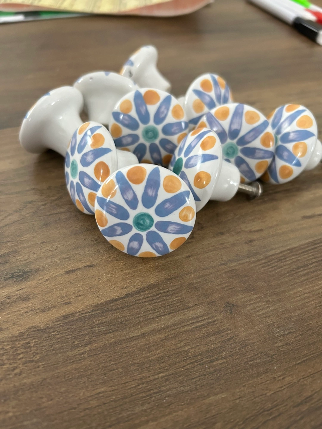 I'm selling a set of decorative ceramic drawer knobs. They feature a cute floral design with blue, orange, and white colours. They're in great shape and would be perfect for adding a touch of charm to your furniture or cabinets!