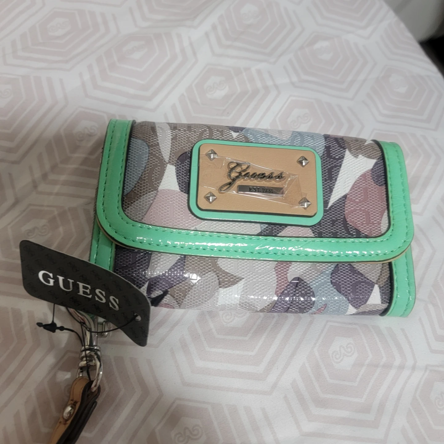 A compact Guess wallet with a colourful abstract pattern and mint green trim. It's got card slots inside and a snap closure. Perfect for keeping your essentials organized!
