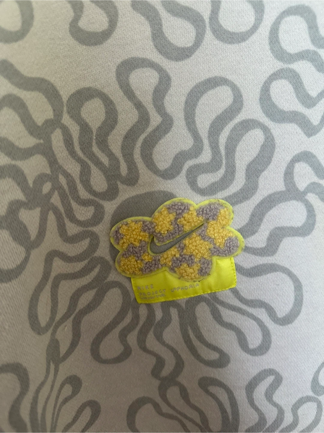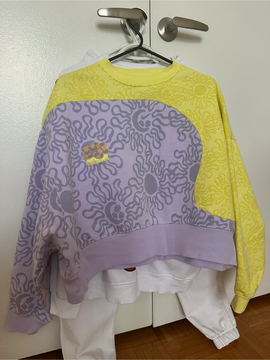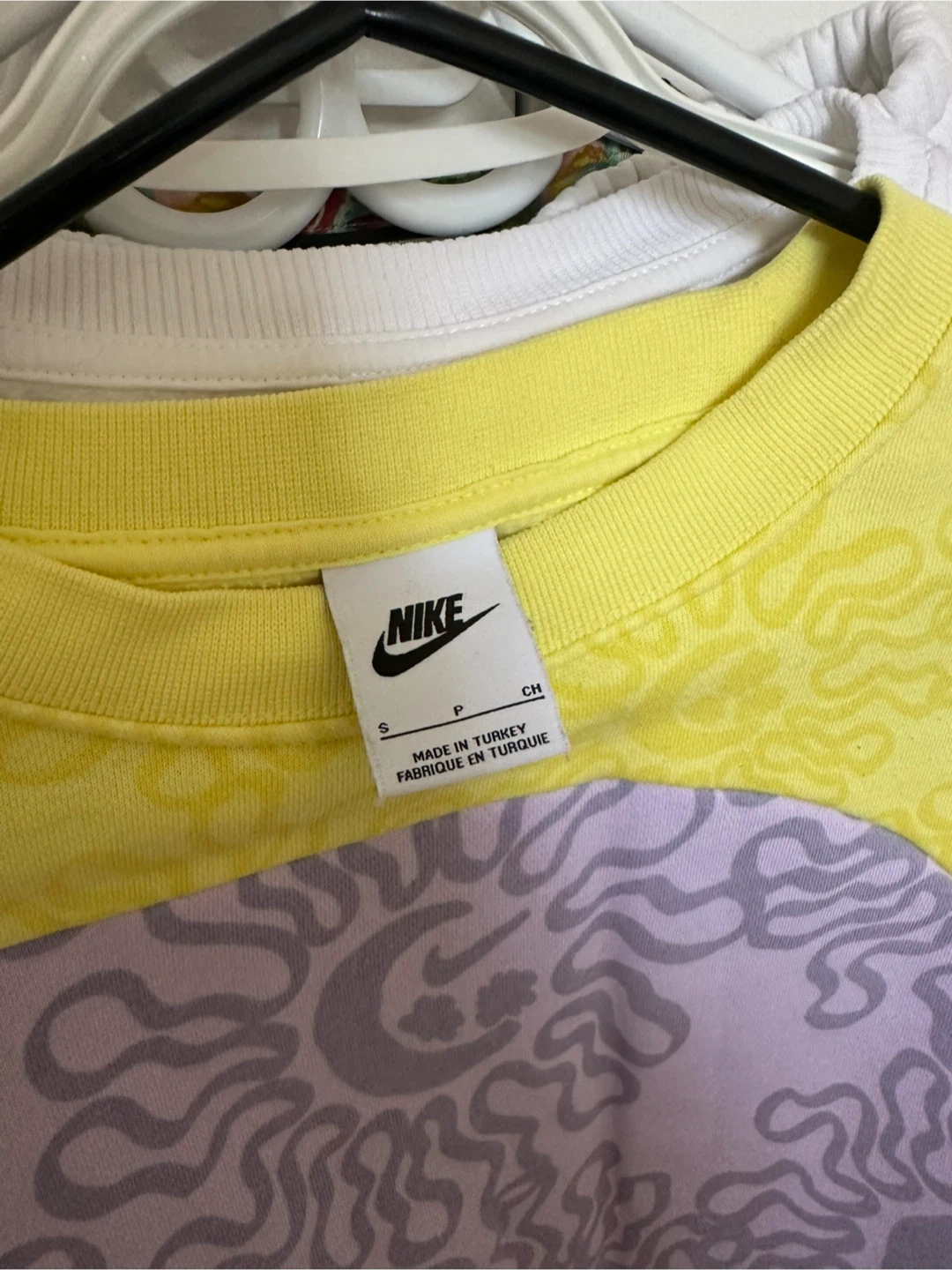 Yellow and lilac graphic print Nike pullover sweatshirt. It's a size S. Made in Turkey. Adds a fun pop of colour to your outfit!
