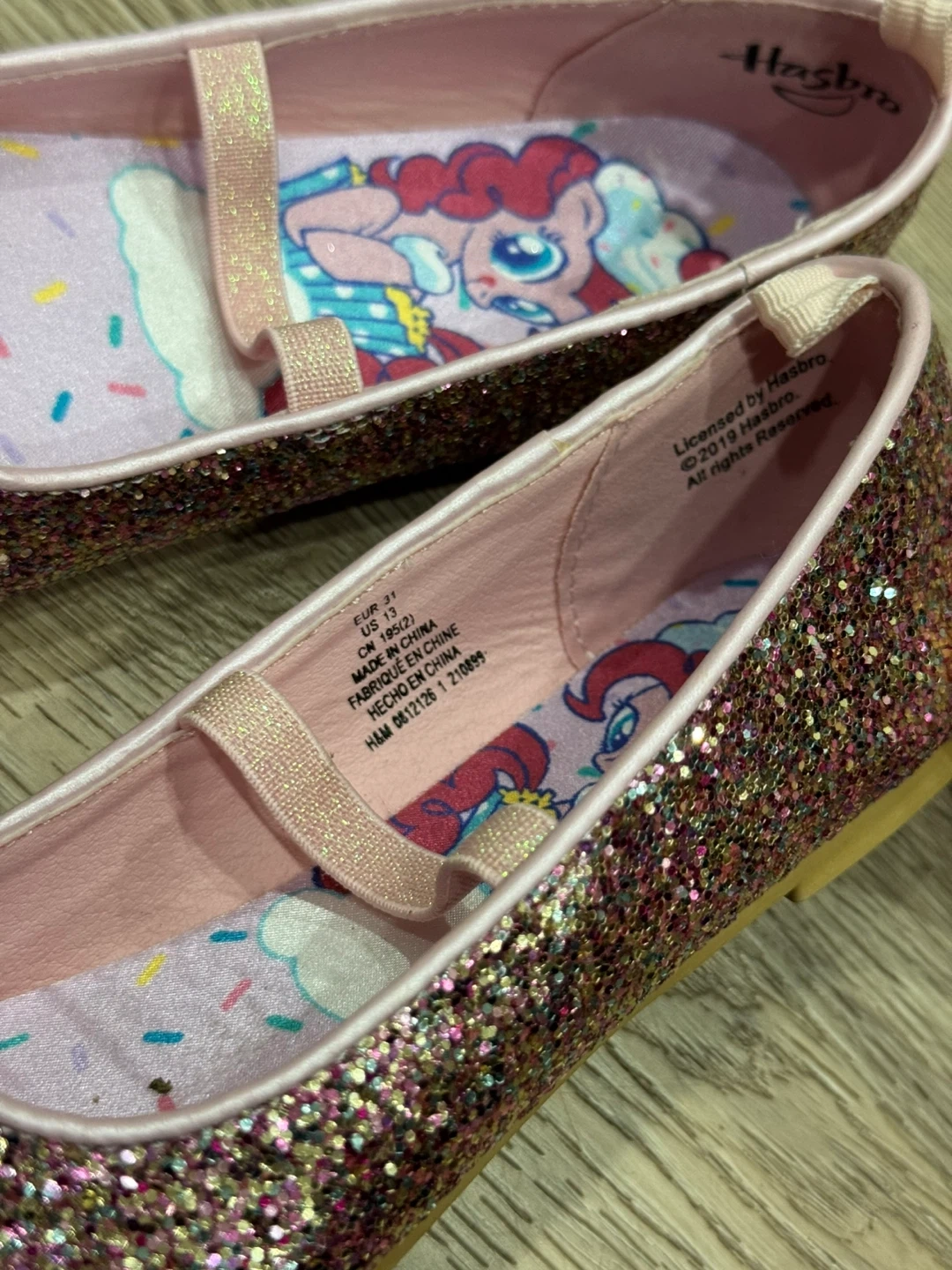 Sparkly glitter ballet flats. My Little Pony characters on the insoles and a pink elastic strap across the top. Children size 13 US, EUR 31.