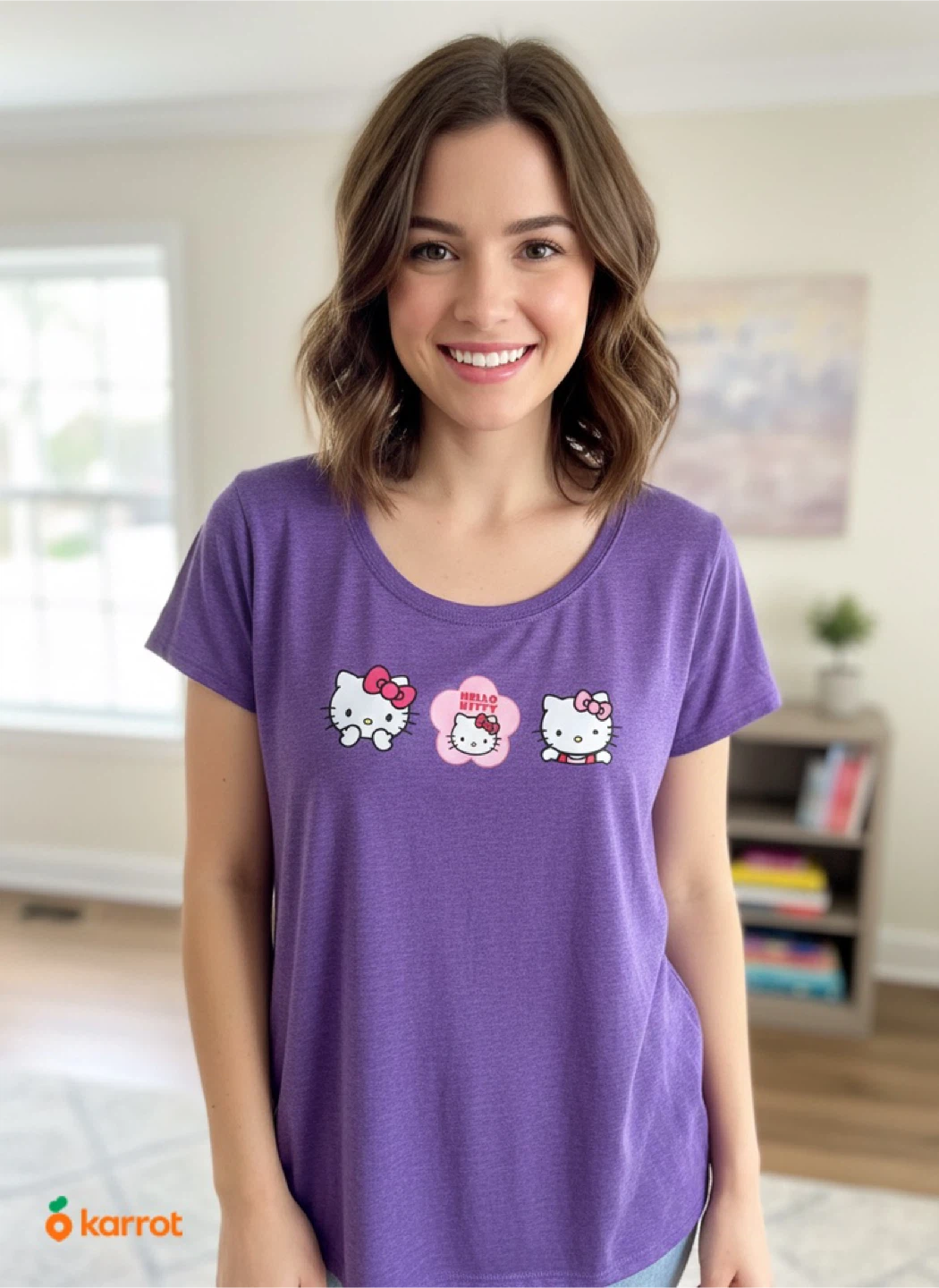 A fun purple t-shirt featuring multiple Hello Kitty graphics. It's made of a comfortable fabric blend. This tee is great for any Hello Kitty fan!